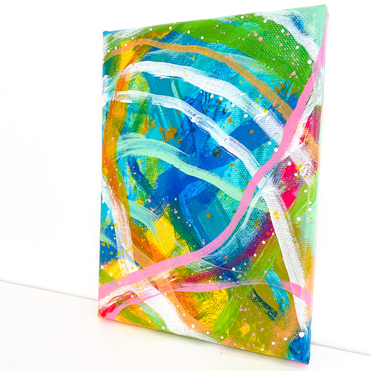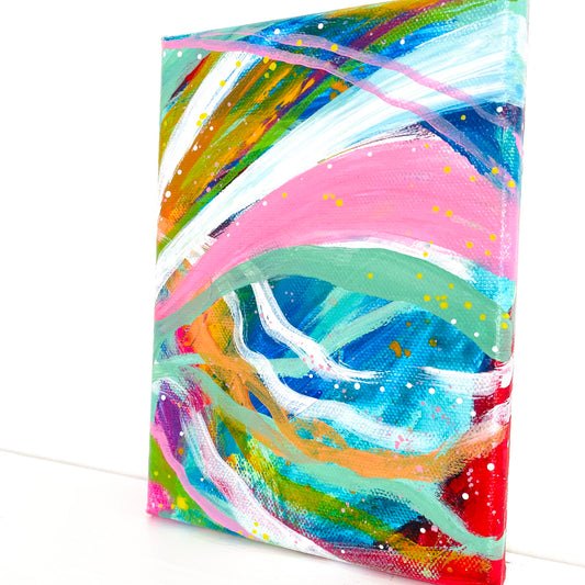 Live Joyfully 4x4 inch original abstract canvas with embroidery thread accents