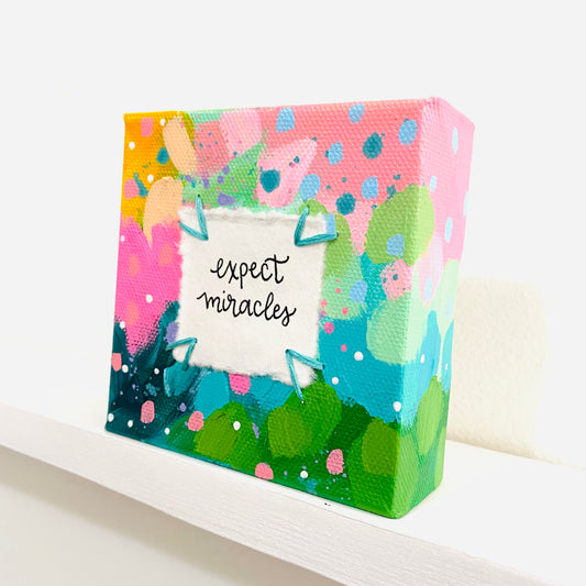 Expect Miracles 4x4 inch original abstract canvas with embroidery thread accents