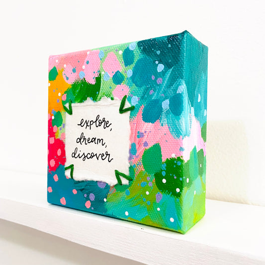 Explore, Dream, Discover 4x4 inch original abstract canvas with embroidery thread accents