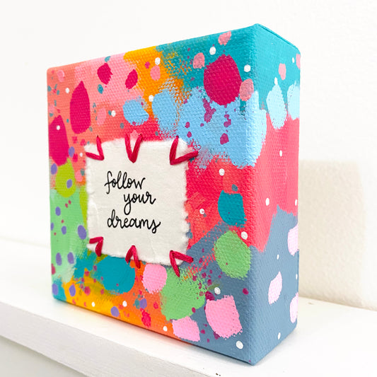 Follow Your Dreams 4x4 inch original abstract canvas with embroidery thread accents