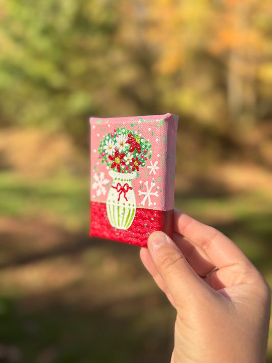 Pink Christmas Tree with Red Bow 6x6 inch original painting on canvas 1