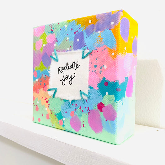 Radiate Joy 4x4 inch original abstract canvas with embroidery thread accents