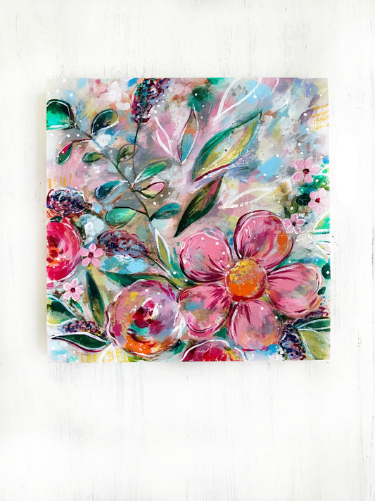 New Spring Floral Mixed Media Painting on 8x8 inch wood panel no.10