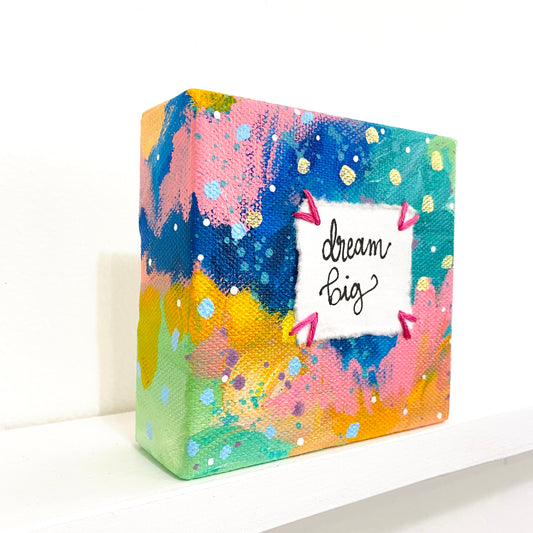 Dream Big 4x4 inch original abstract canvas with embroidery thread accents