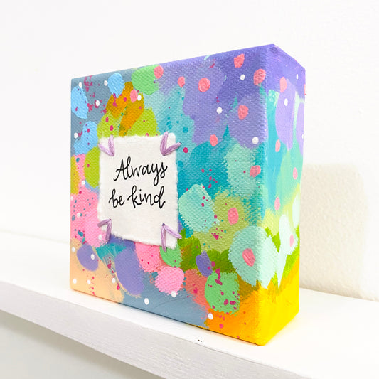 Always Be Kind 4x4 inch original abstract canvas with embroidery thread accents