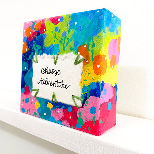 Choose Adventure 4x4 inch original abstract canvas with embroidery thread accents