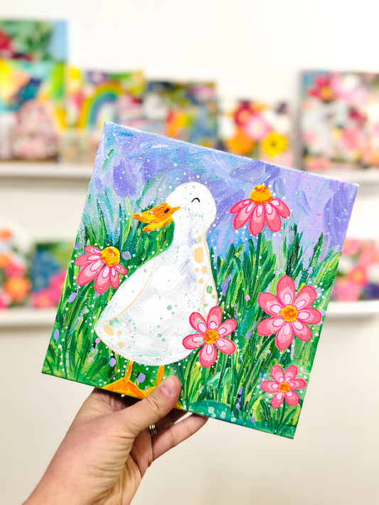 “Happiness in Spring” Floral Duck Painting on 8x8 inch canvas