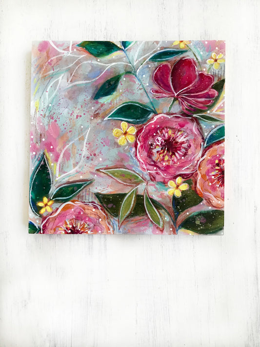 New Spring Floral Mixed Media Painting on 8x8 inch wood panel no.1