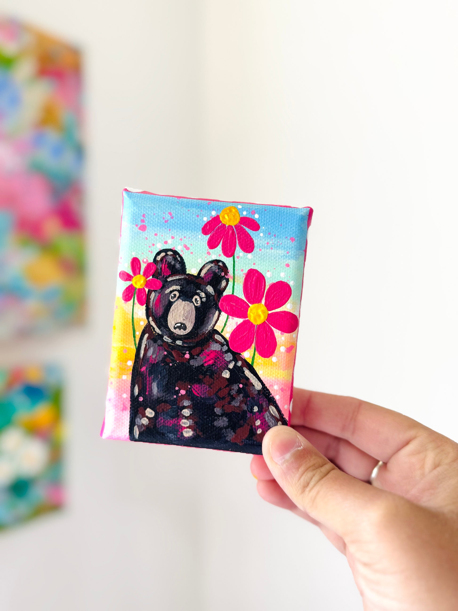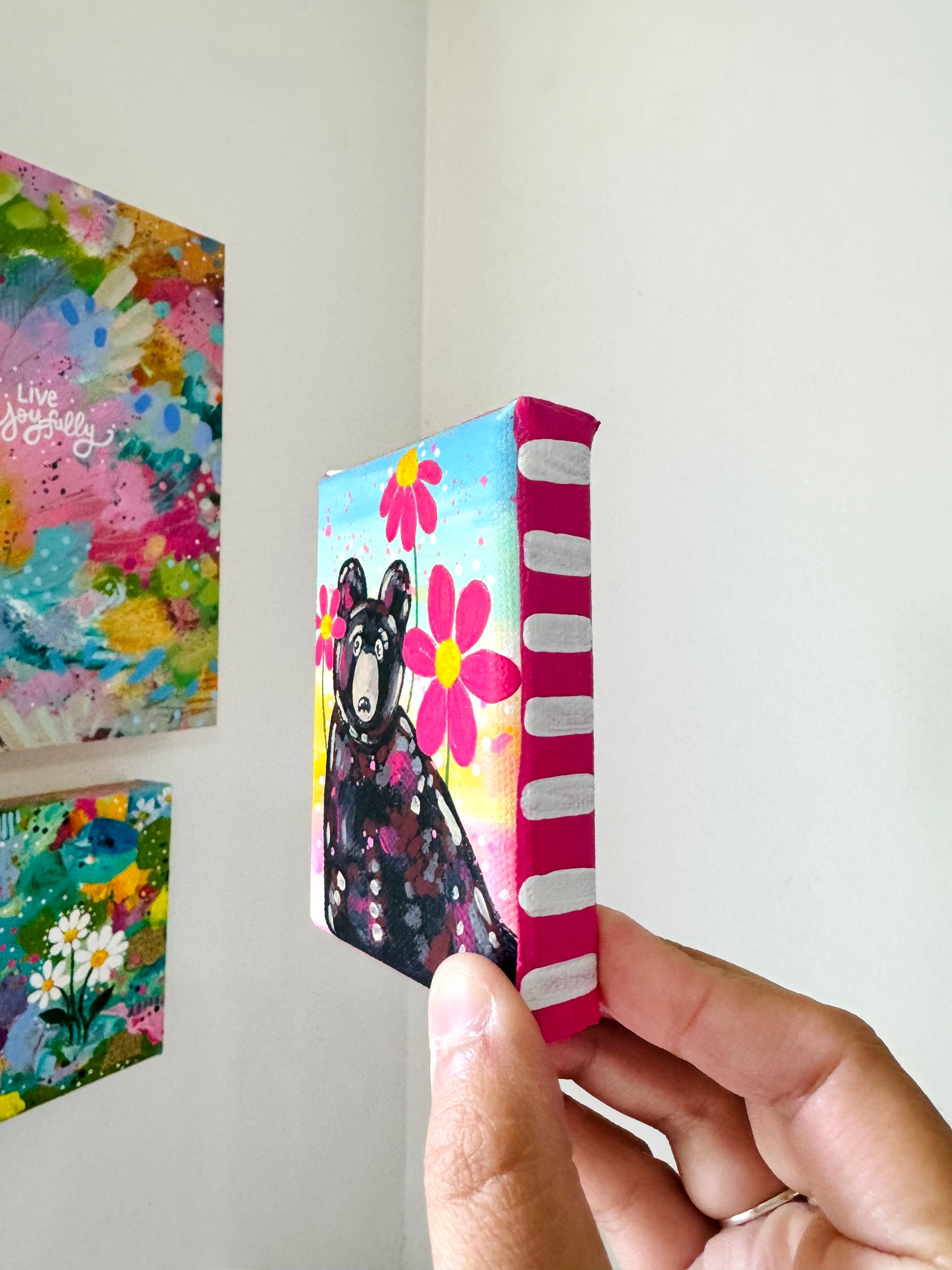This original vibrant black bear floral inspired painting was created on canvas that measures approximately 3x4 inches with .75 inch thick sides. The sides are painted all around with whimsical stripes to match the colors of the painting. This acrylic painting has been sealed with a semi-gloss varnish as well, for protection.