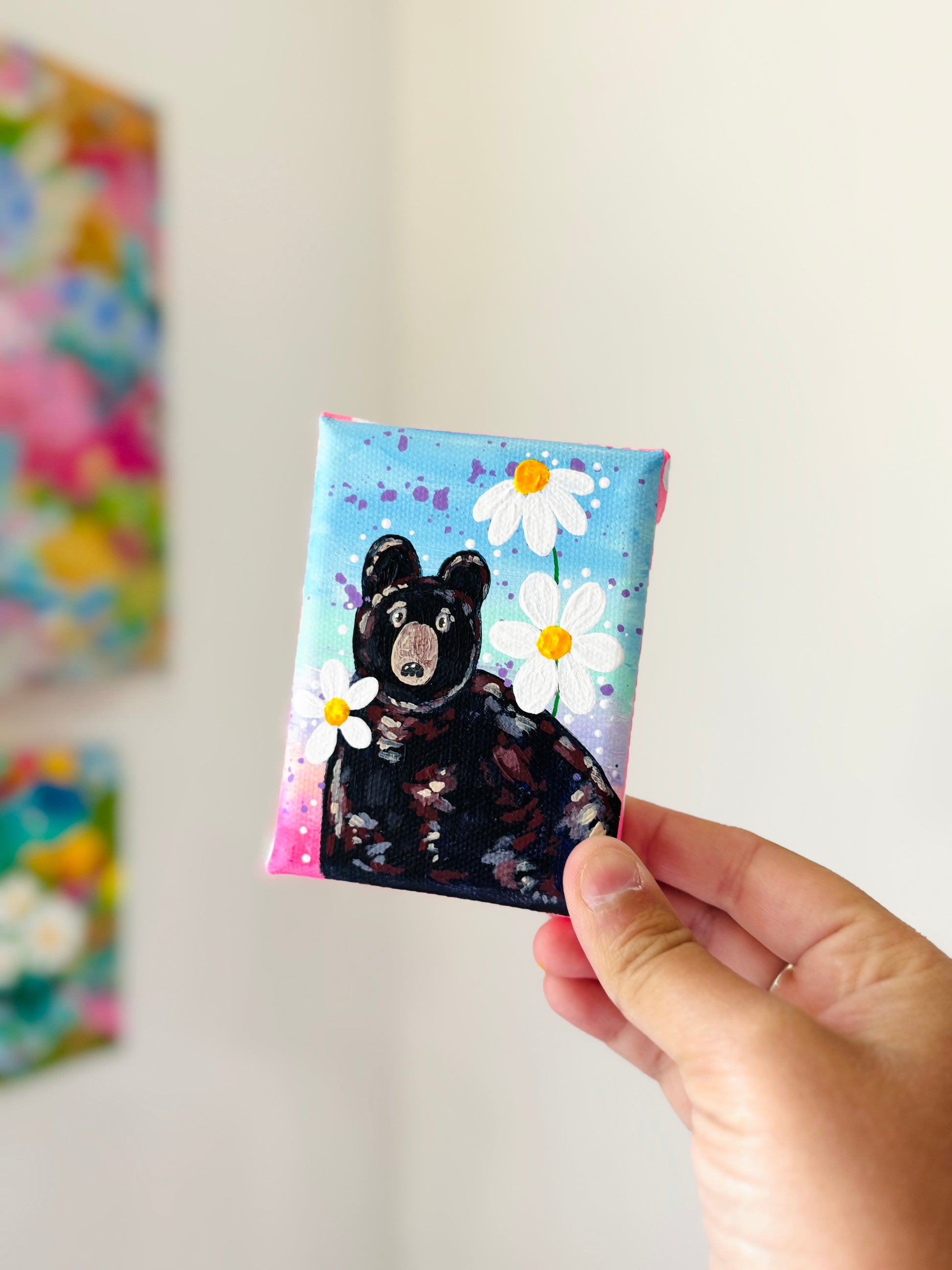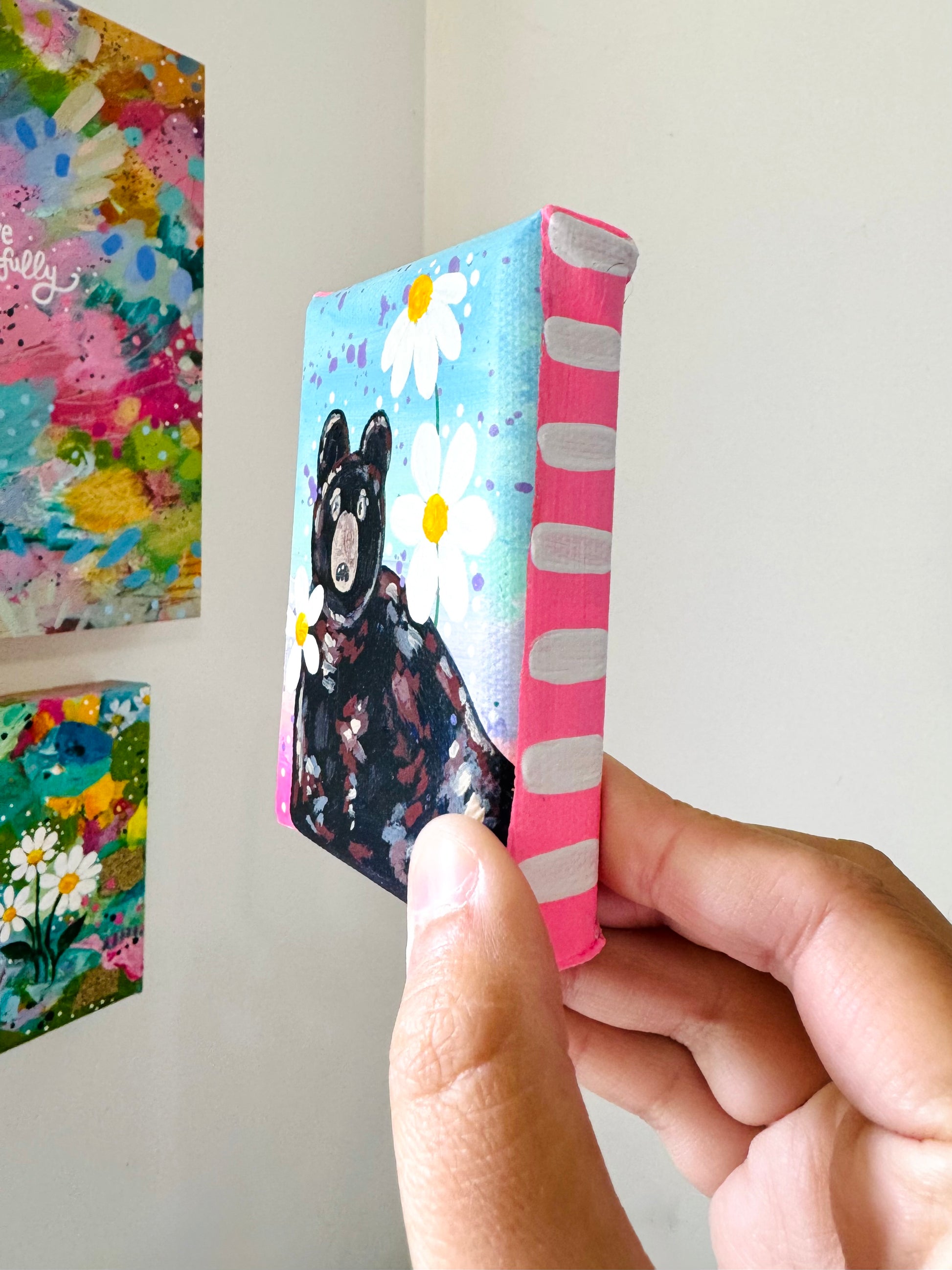 This original vibrant black bear floral inspired painting was created on canvas that measures approximately 3x4 inches with .75 inch thick sides. The sides are painted all around with whimsical stripes to match the colors of the painting. This acrylic painting has been sealed with a semi-gloss varnish as well, for protection.