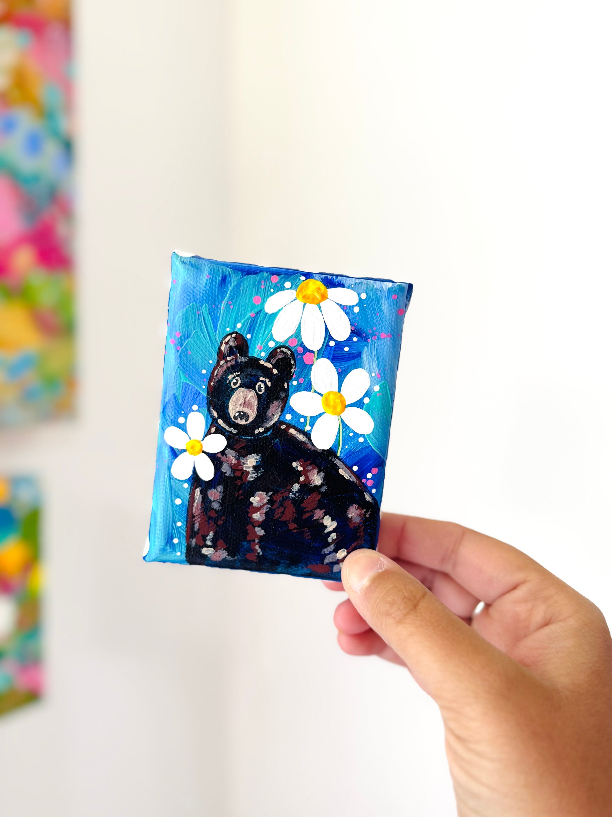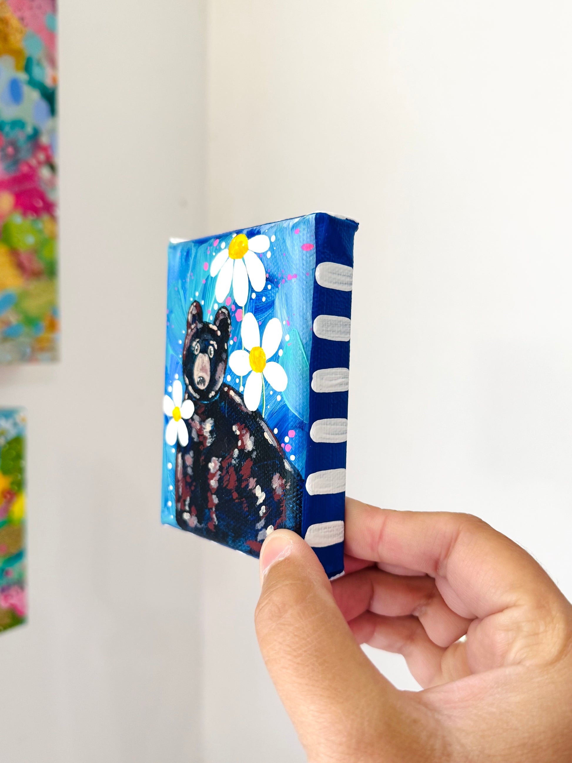 This original vibrant black bear floral inspired painting was created on canvas that measures approximately 3x4 inches with .75 inch thick sides. The sides are painted all around with whimsical stripes to match the colors of the painting. This acrylic painting has been sealed with a semi-gloss varnish as well, for protection.