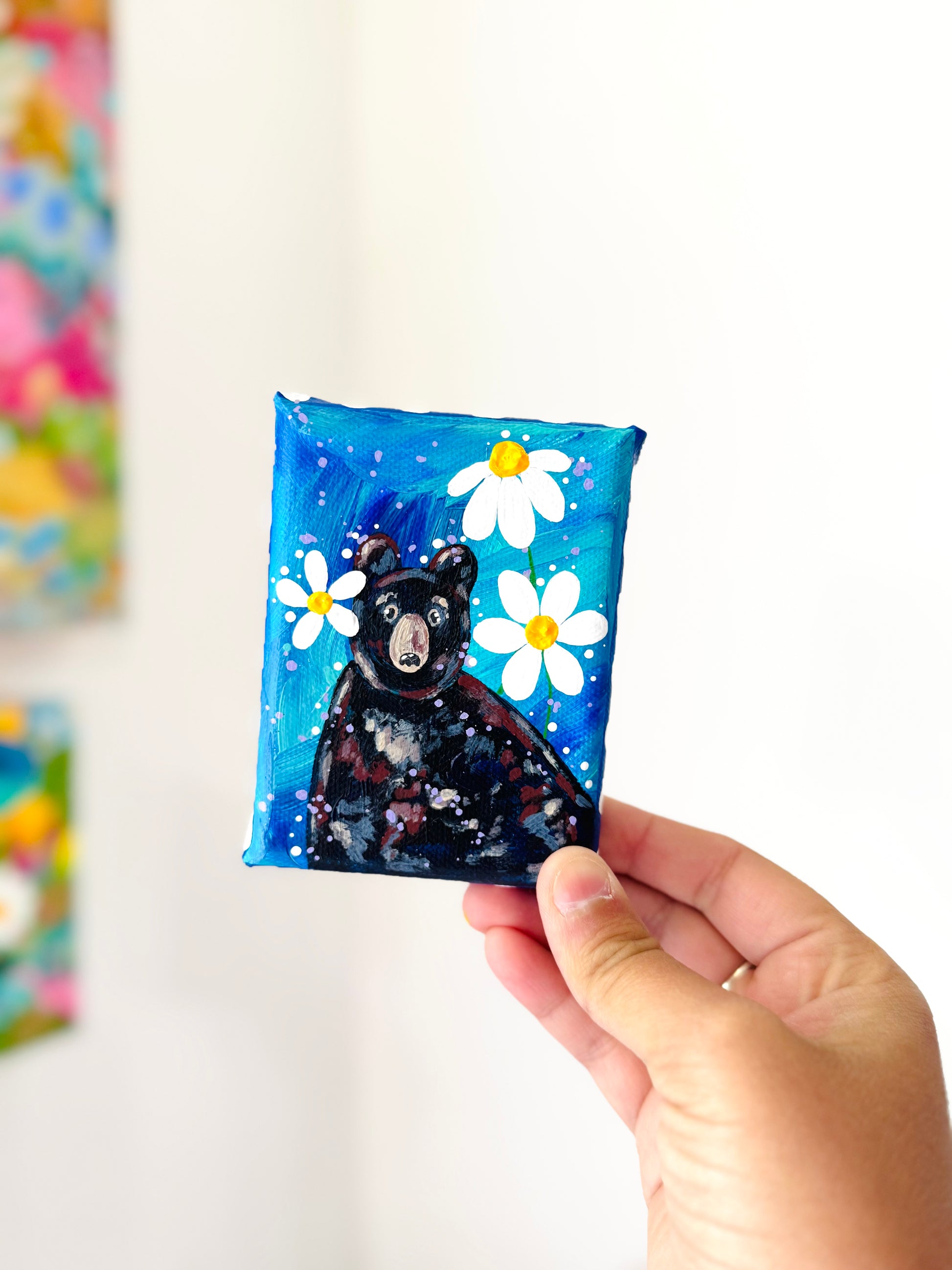 This original vibrant black bear floral inspired painting was created on canvas that measures approximately 3x4 inches with .75 inch thick sides. The sides are painted all around with whimsical stripes to match the colors of the painting. This acrylic painting has been sealed with a semi-gloss varnish as well, for protection.