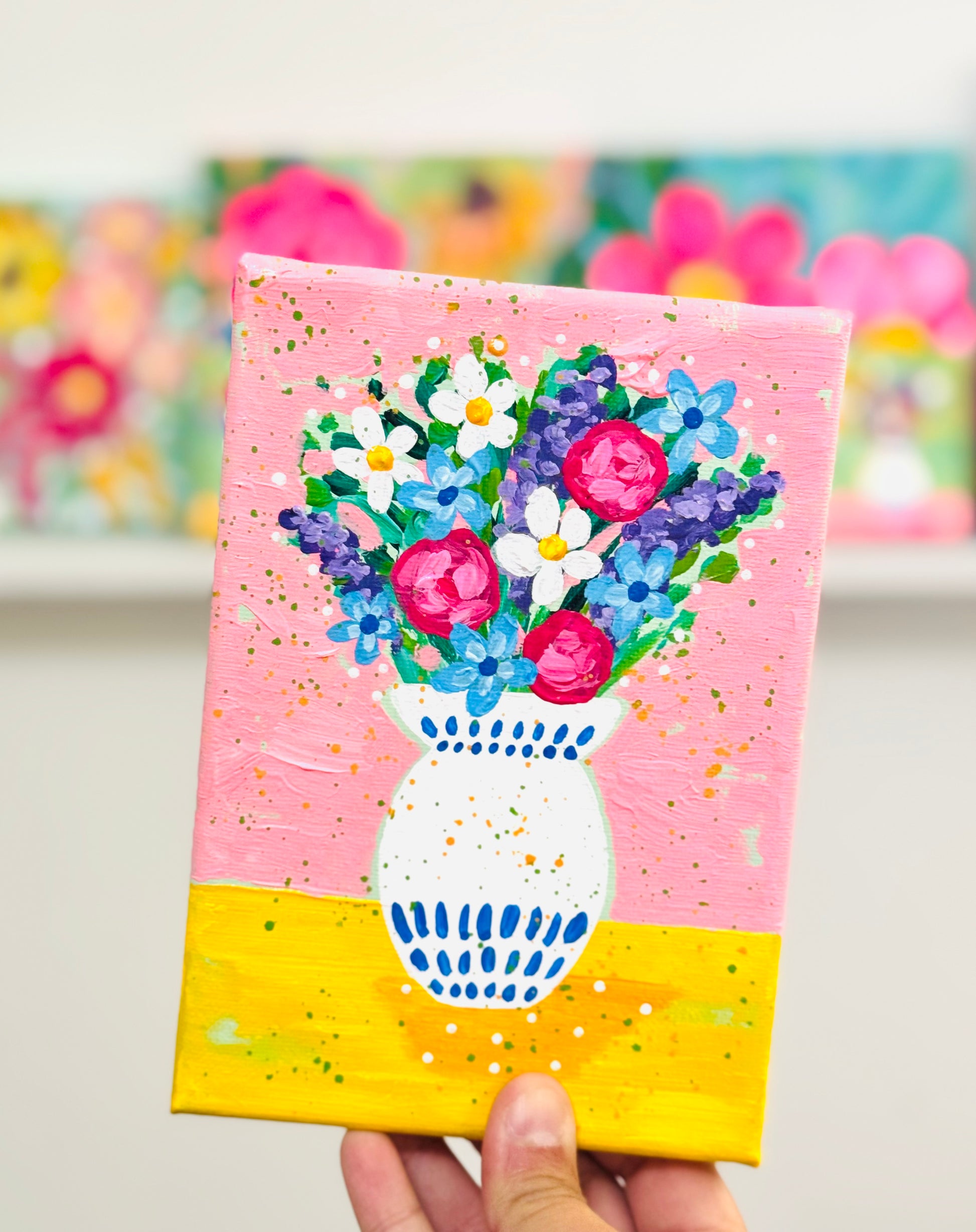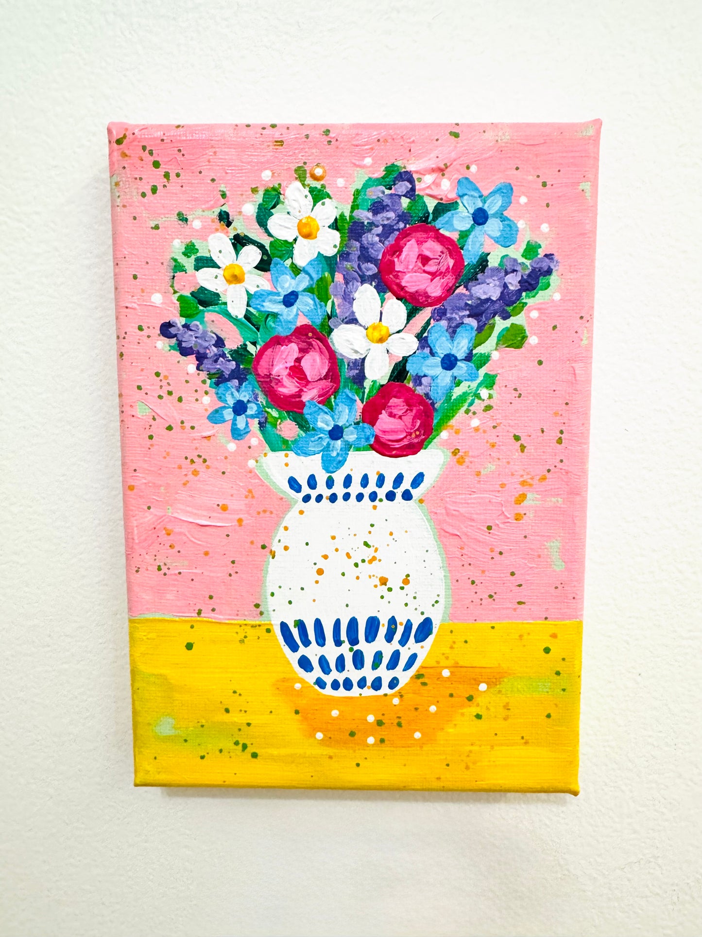 "Blissful Morning" is a vibrant, floral-inspired original featuring a cheerful bouquet in a whimsical little vase. Bursting with bold color and playful charm, this sweet painting brings the lighthearted spirit of spring to life—perfect for sparking joy in any space.