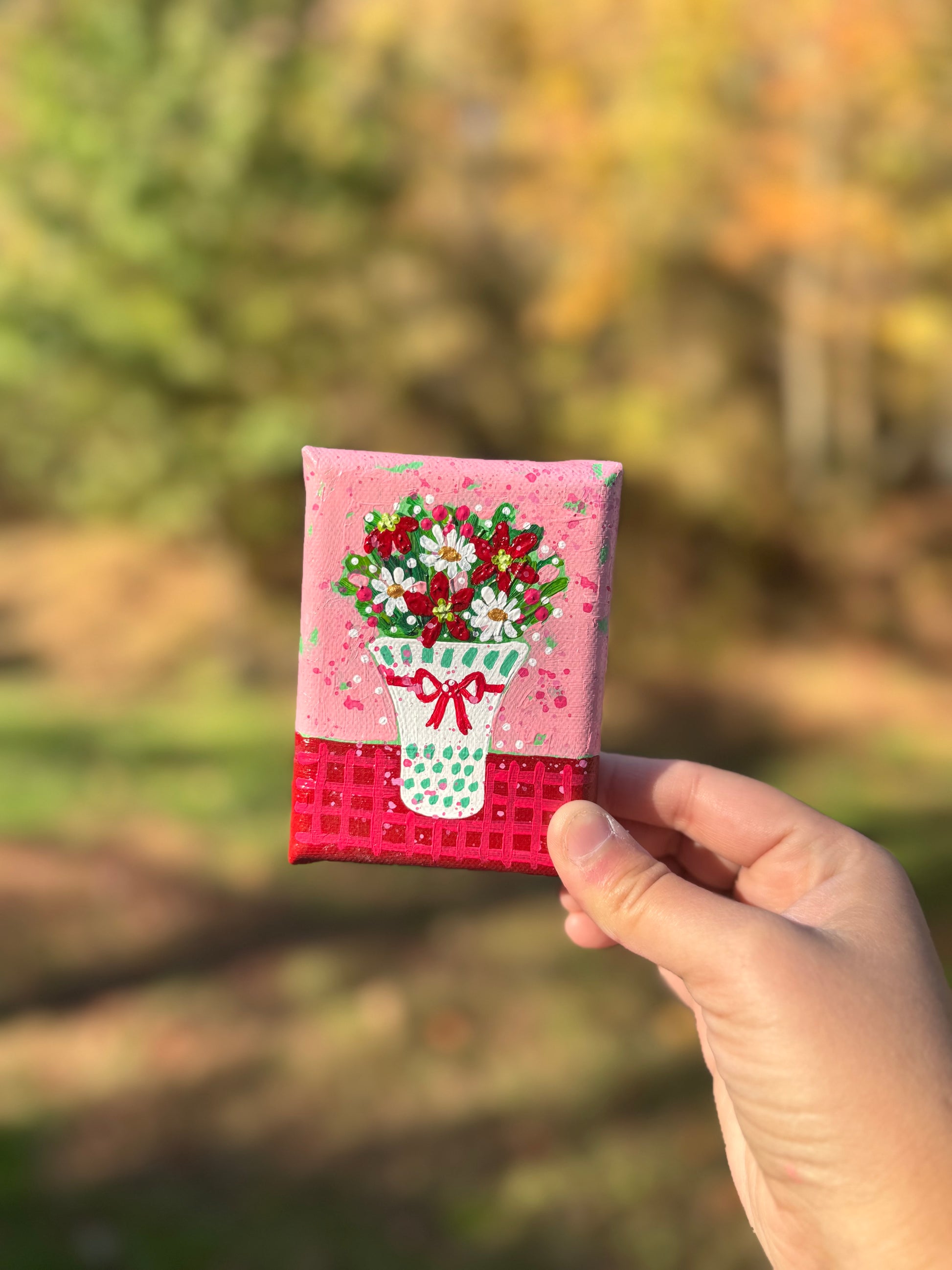 This original Christmas floral bouquet painting was created on canvas that measures approximately 3x4 inches with .75 inch thick sides. The sides are painted all around to match the style/colors of the painting. This acrylic painting has been sealed with a semi-gloss varnish as well, for protection.