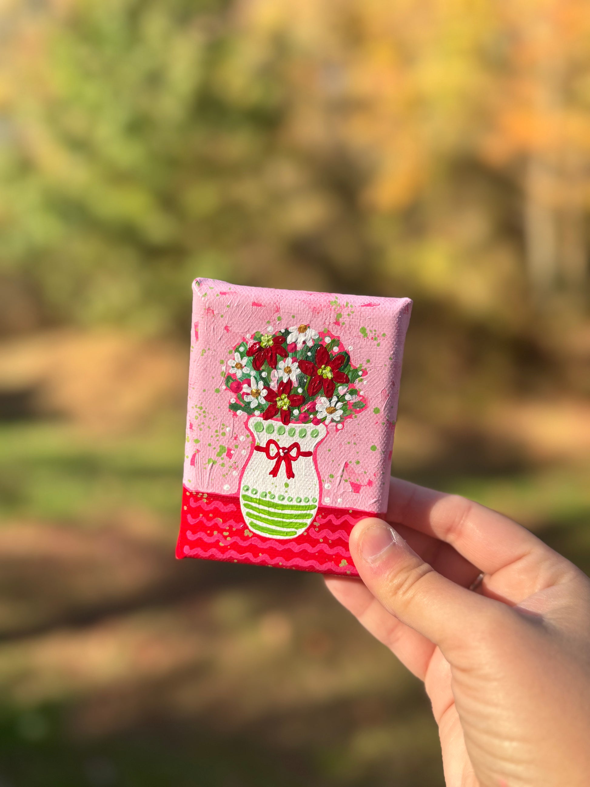 This original Christmas floral bouquet painting was created on canvas that measures approximately 3x4 inches with .75 inch thick sides. The sides are painted all around to match the style/colors of the painting. This acrylic painting has been sealed with a semi-gloss varnish as well, for protection.