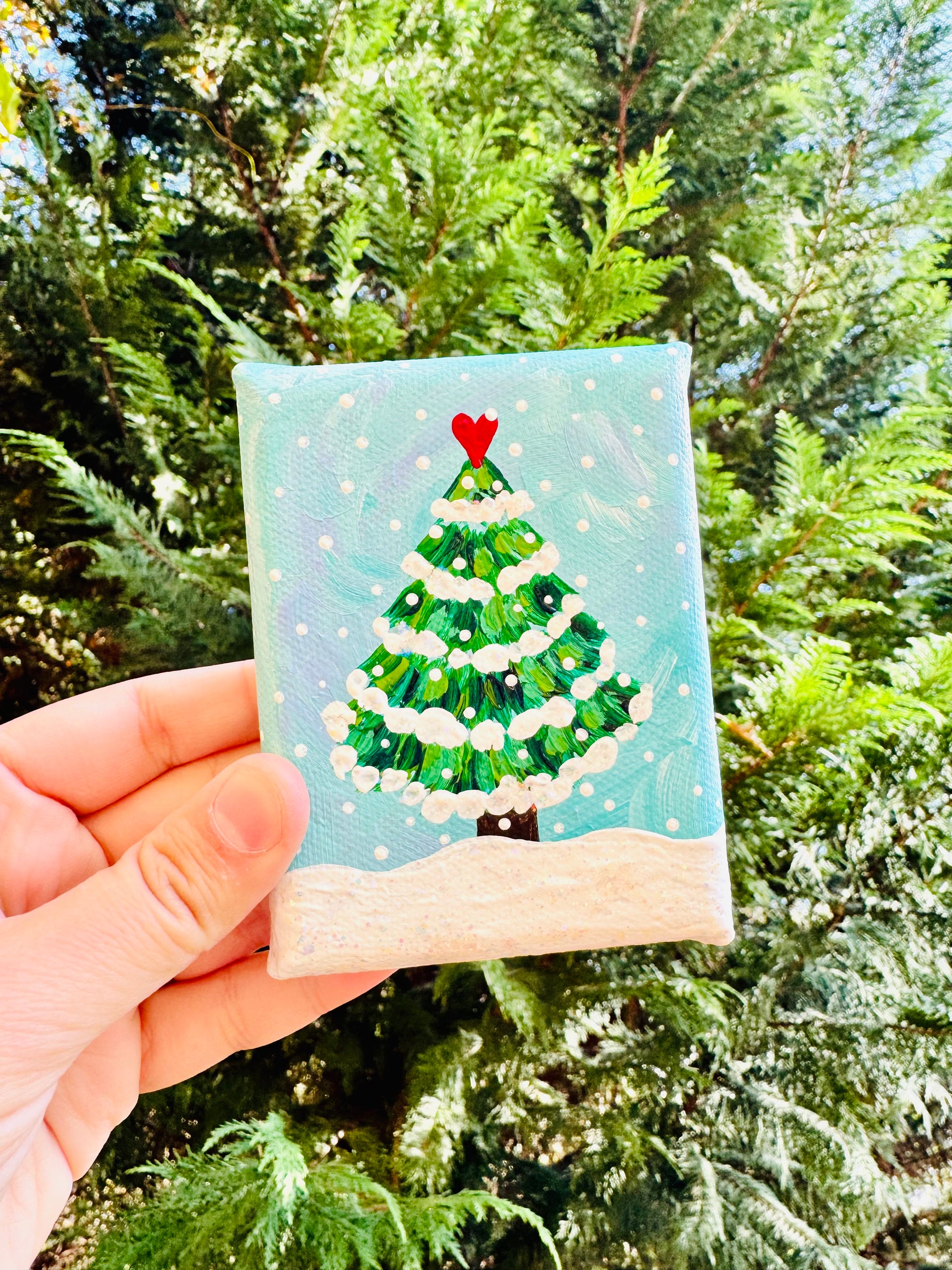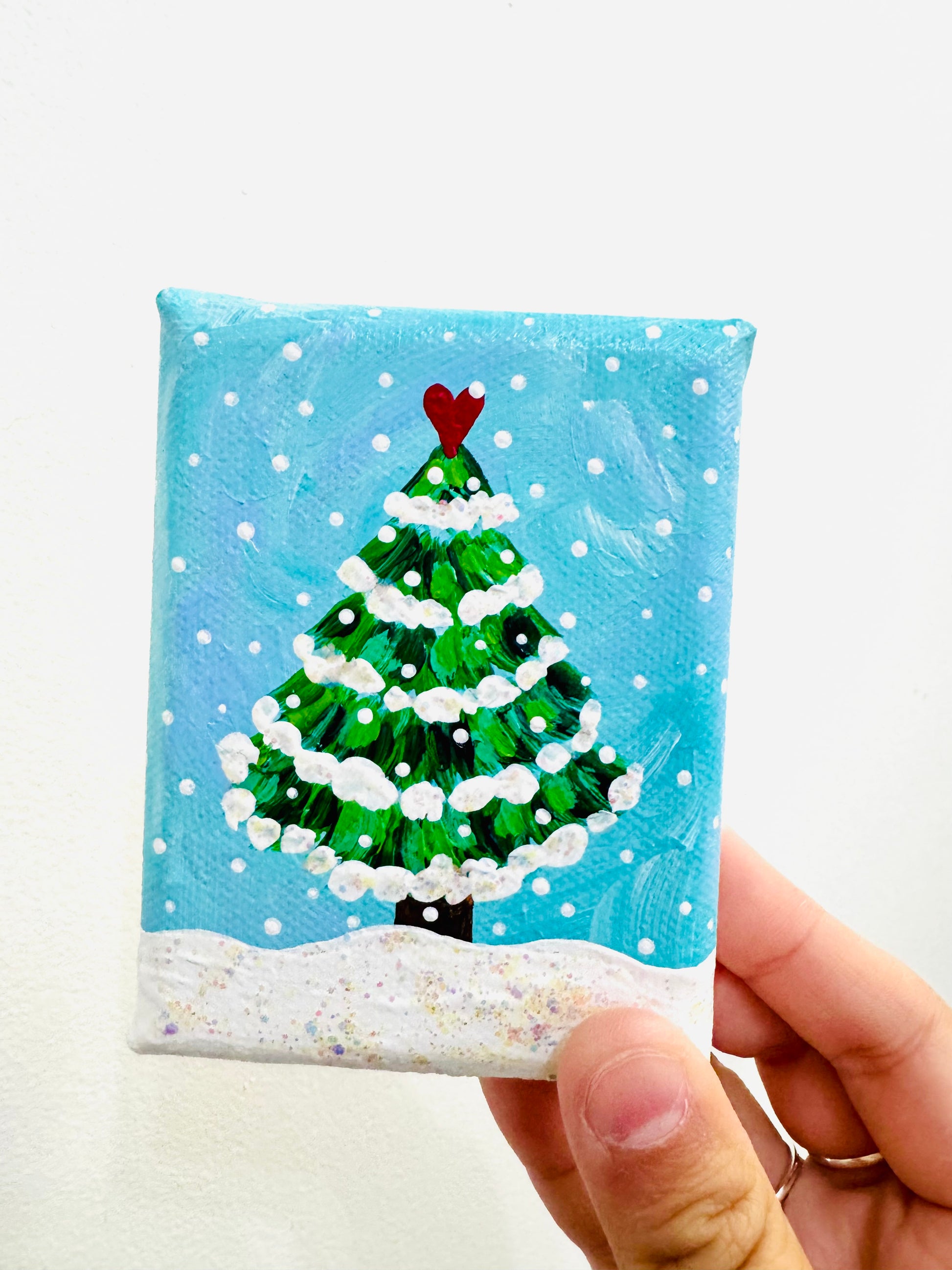 This original Christmas tree painting was created on canvas that measures approximately 3x4 inches with .5 inch thick sides. The sides are painted all around to match the style/colors of the painting. This acrylic painting has been sealed with a semi-gloss varnish as well, for protection (and to keep the glitter from going anywhere!).