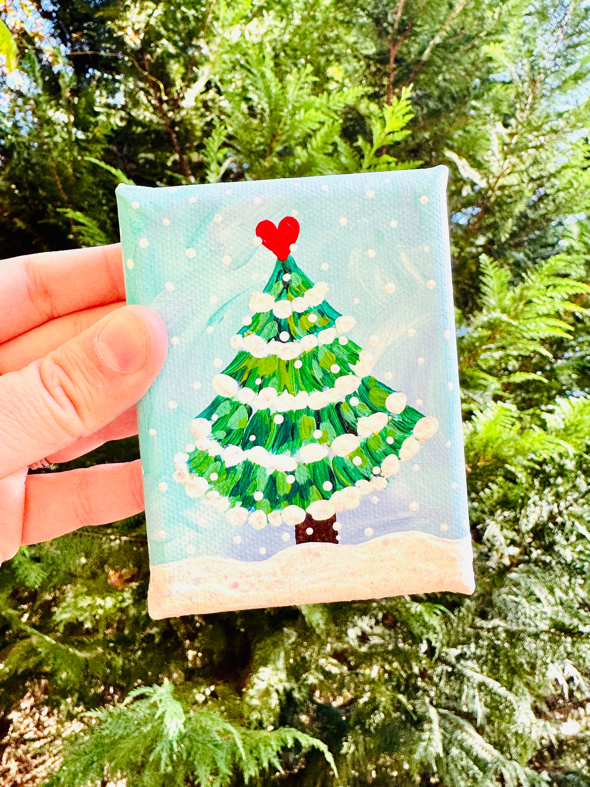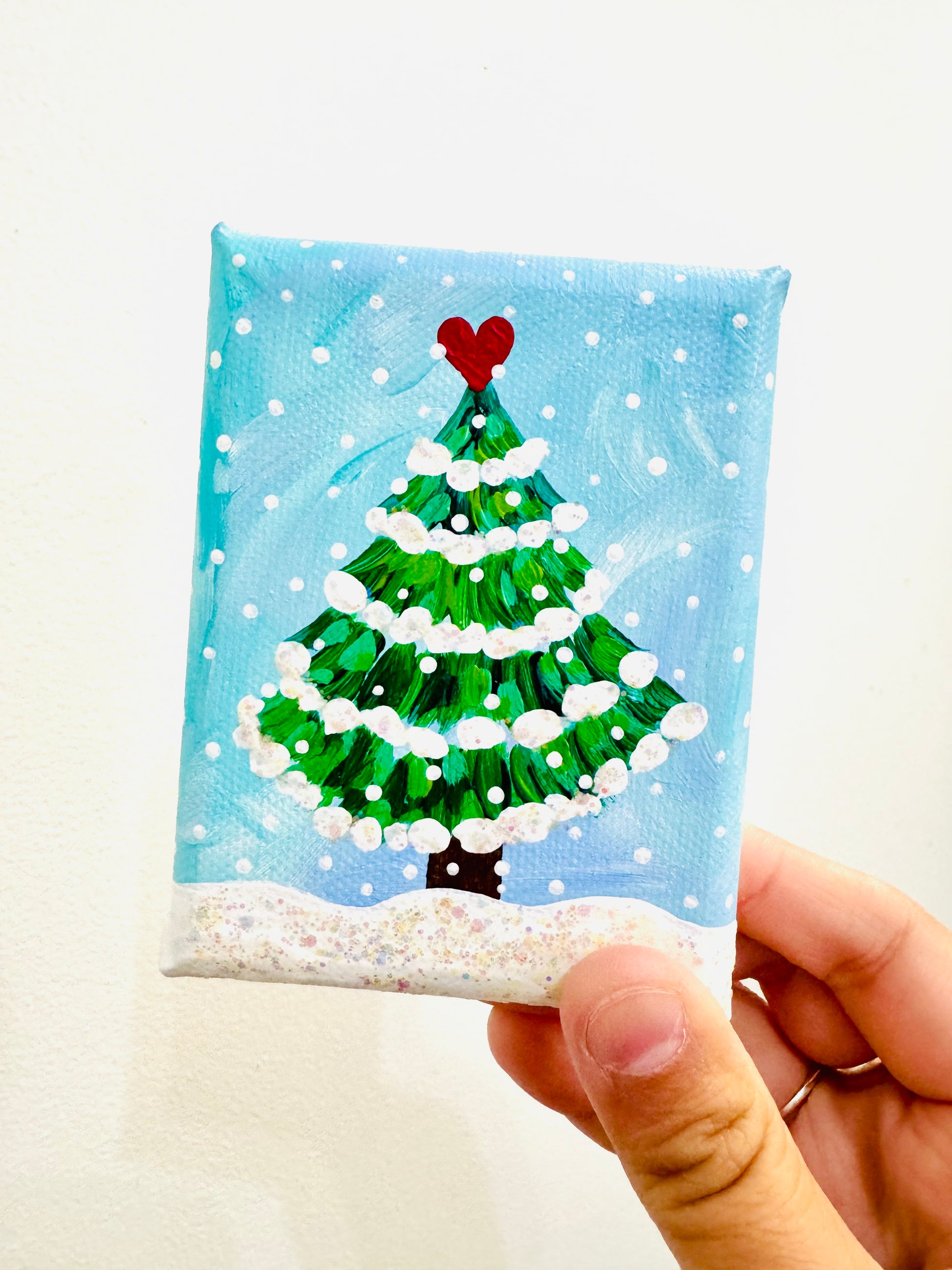 This original Christmas tree painting was created on canvas that measures approximately 3x4 inches with .5 inch thick sides. The sides are painted all around to match the style/colors of the painting. This acrylic painting has been sealed with a semi-gloss varnish as well, for protection (and to keep the glitter from going anywhere!).