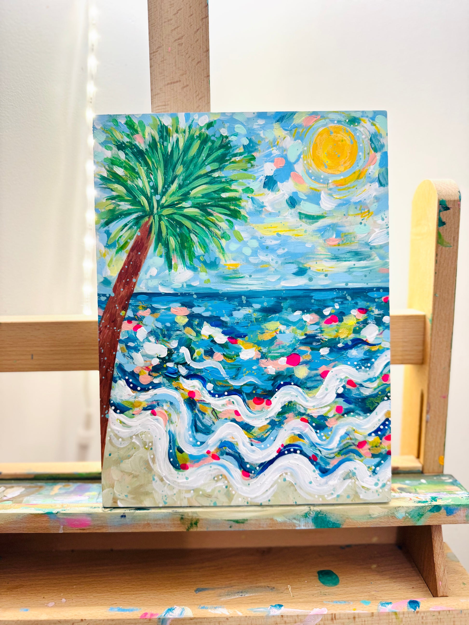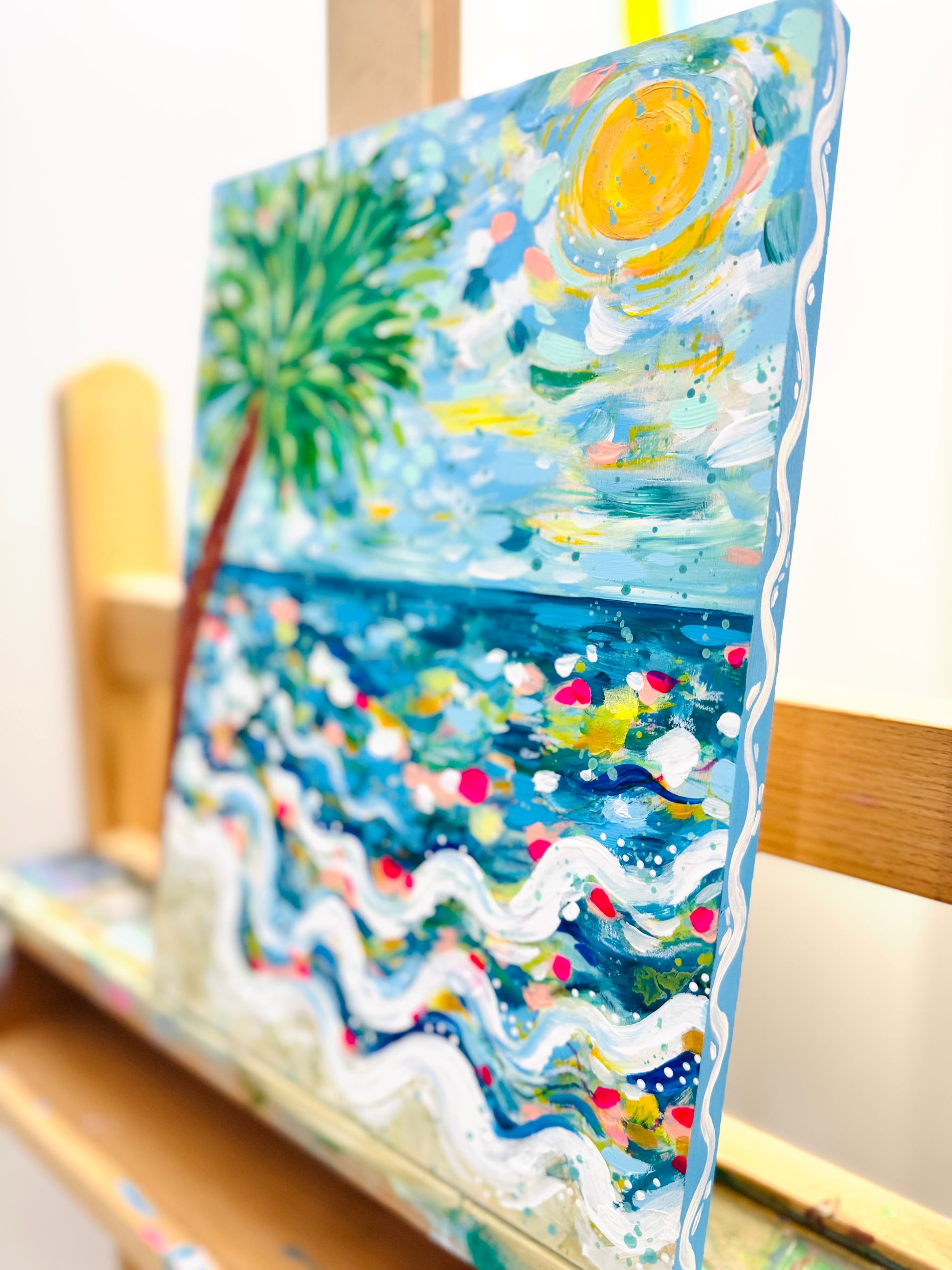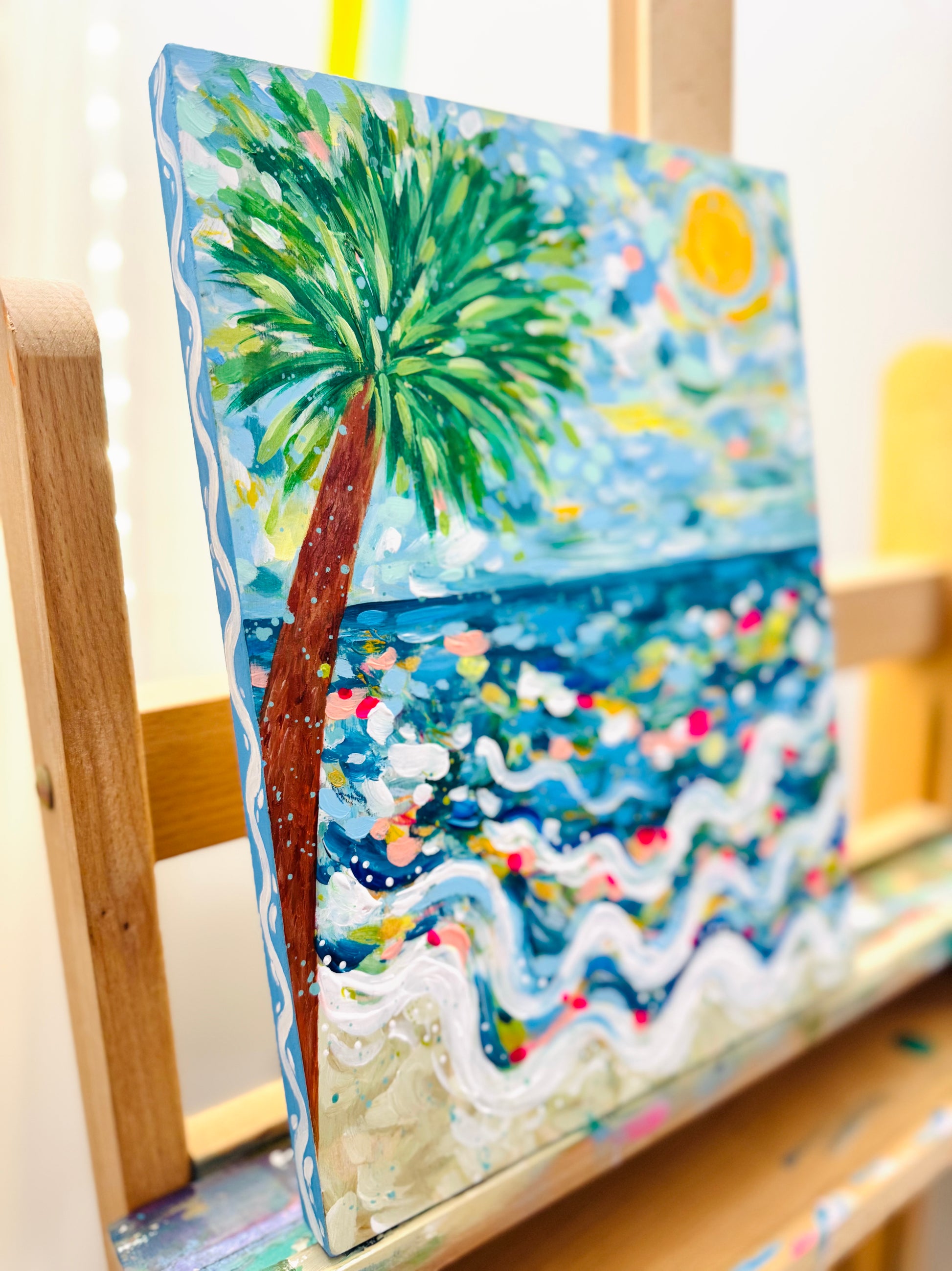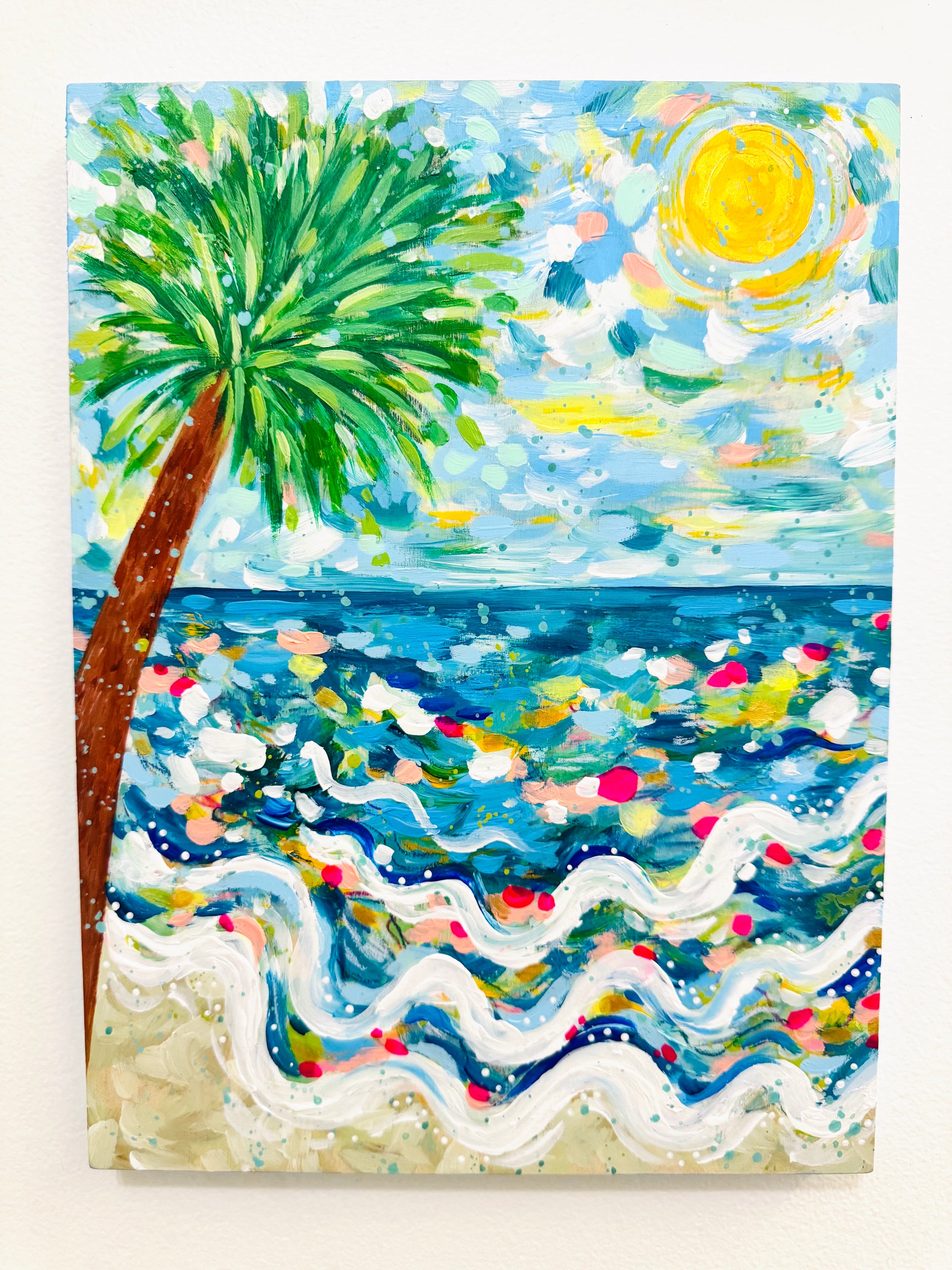 "Coastal Glow" is an original, colorful beach-inspired painting created with acrylic on a 9x12 inch wood panel with .5 inch sides. The sides are fully painted in sky blue with white wavy accents to complement the colors of the artwork, giving it a finished, ready-to-display look from every angle.