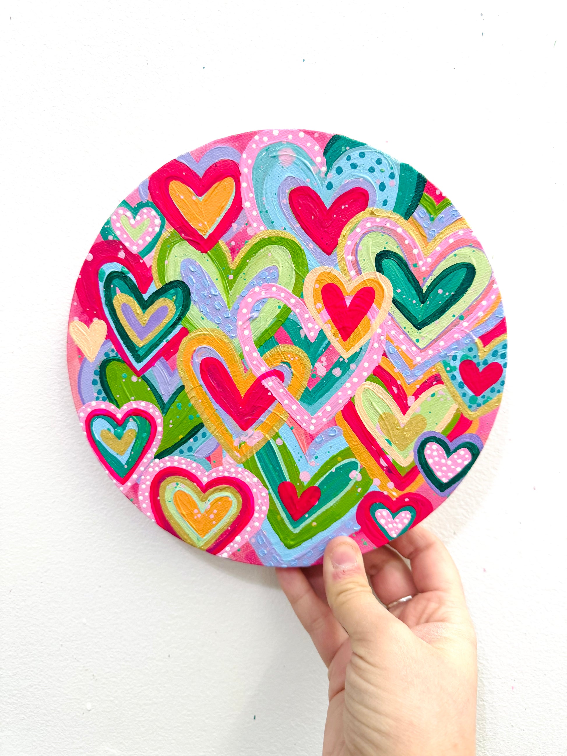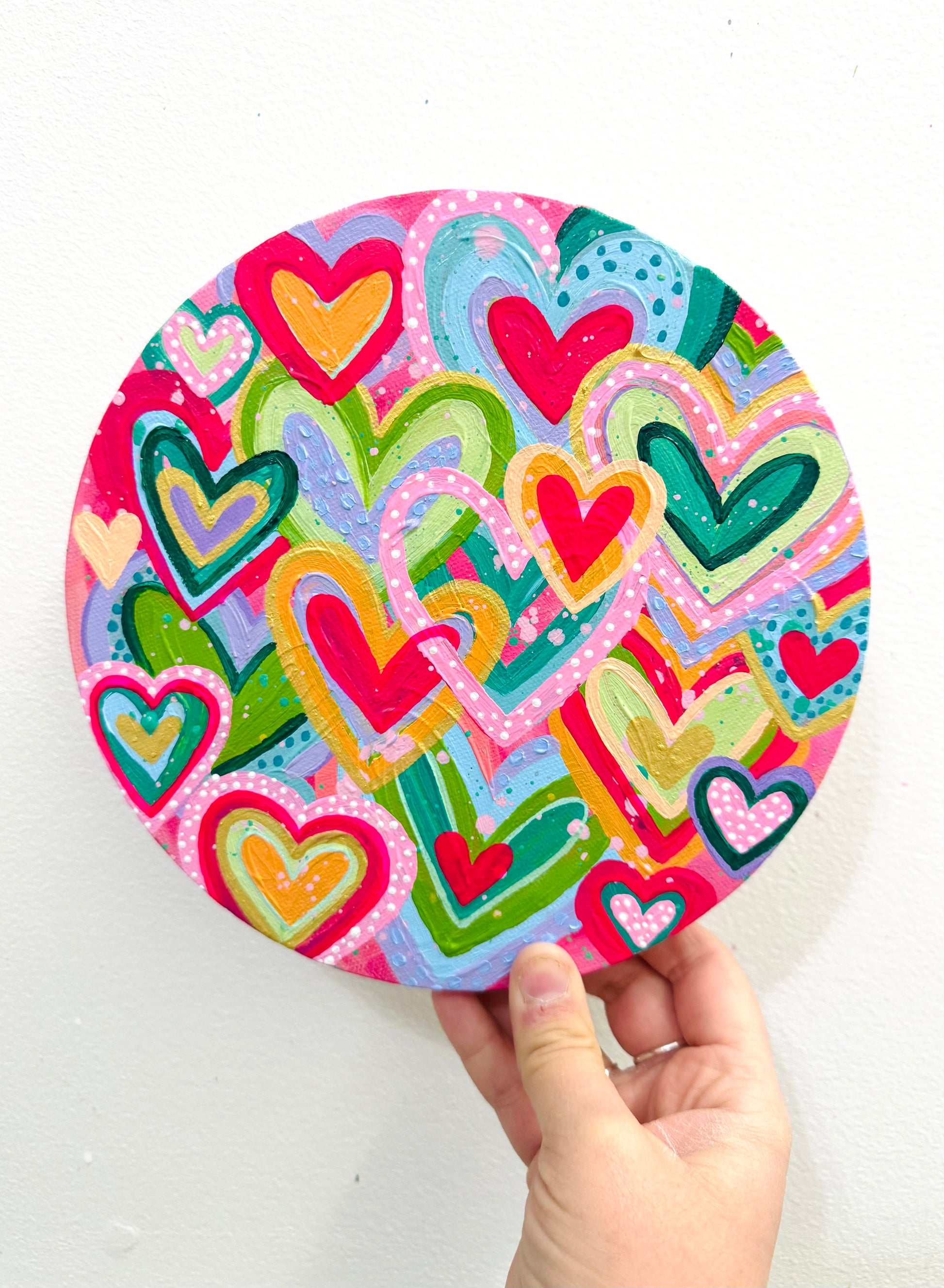 This original colorful heart painting painting was created on a circle canvas that has approximately an 8 inch diameter with .5 inch thick sides. The sides are painted all around to match the main pink color of the painting. This acrylic painting has been sealed with a semi-gloss varnish as well, for protection.