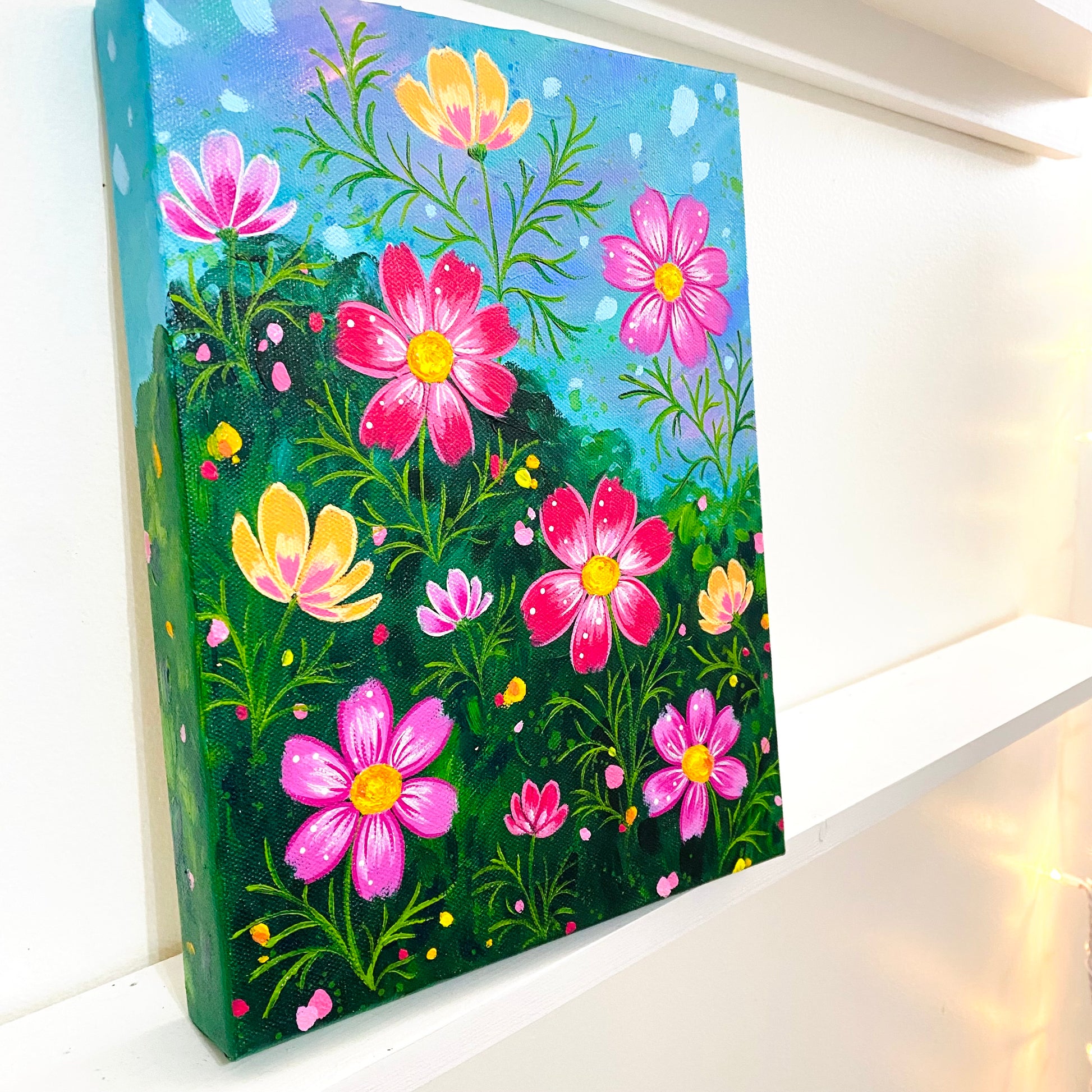 "Cosmo Fields” was created with acrylic paints and lots of love! Layers of floral inspired color to remind you of your favorite garden days.