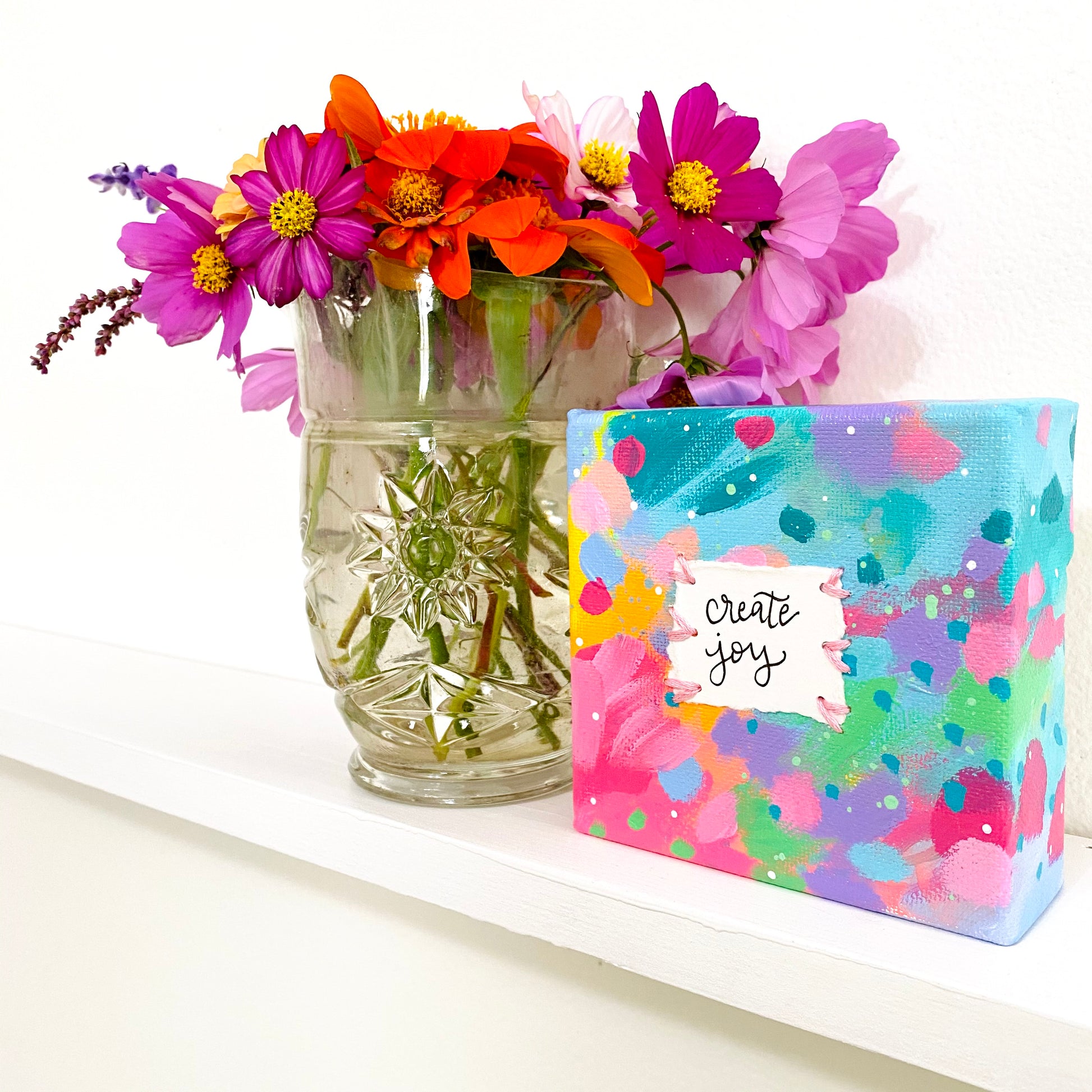 Create Joy 4x4 inch original abstract canvas with embroidery thread accents