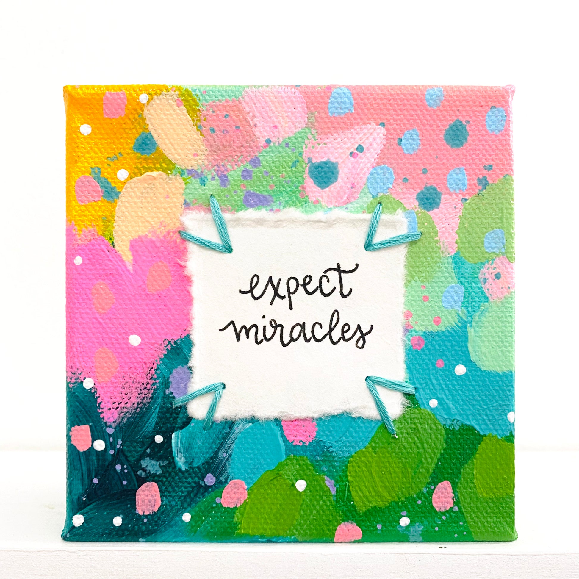 Expect Miracles 4x4 inch original abstract canvas with embroidery thread accents
