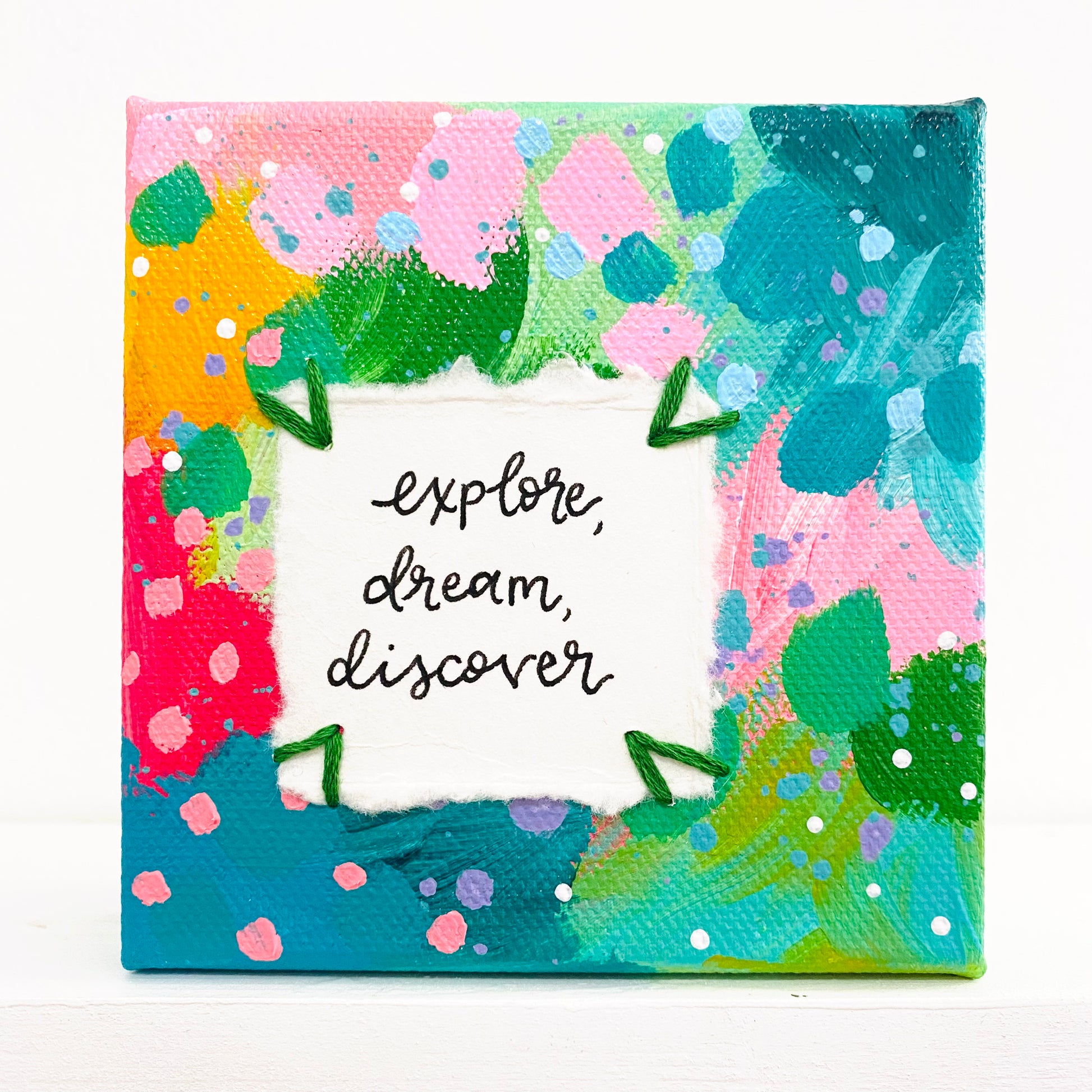 Explore, Dream, Discover 4x4 inch original abstract canvas with embroidery thread accents