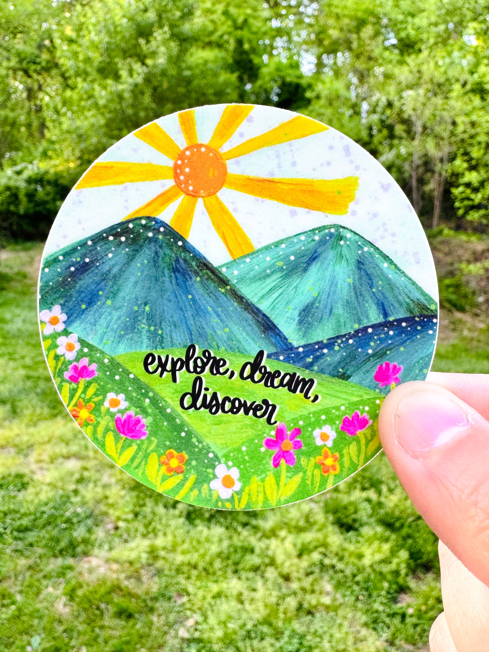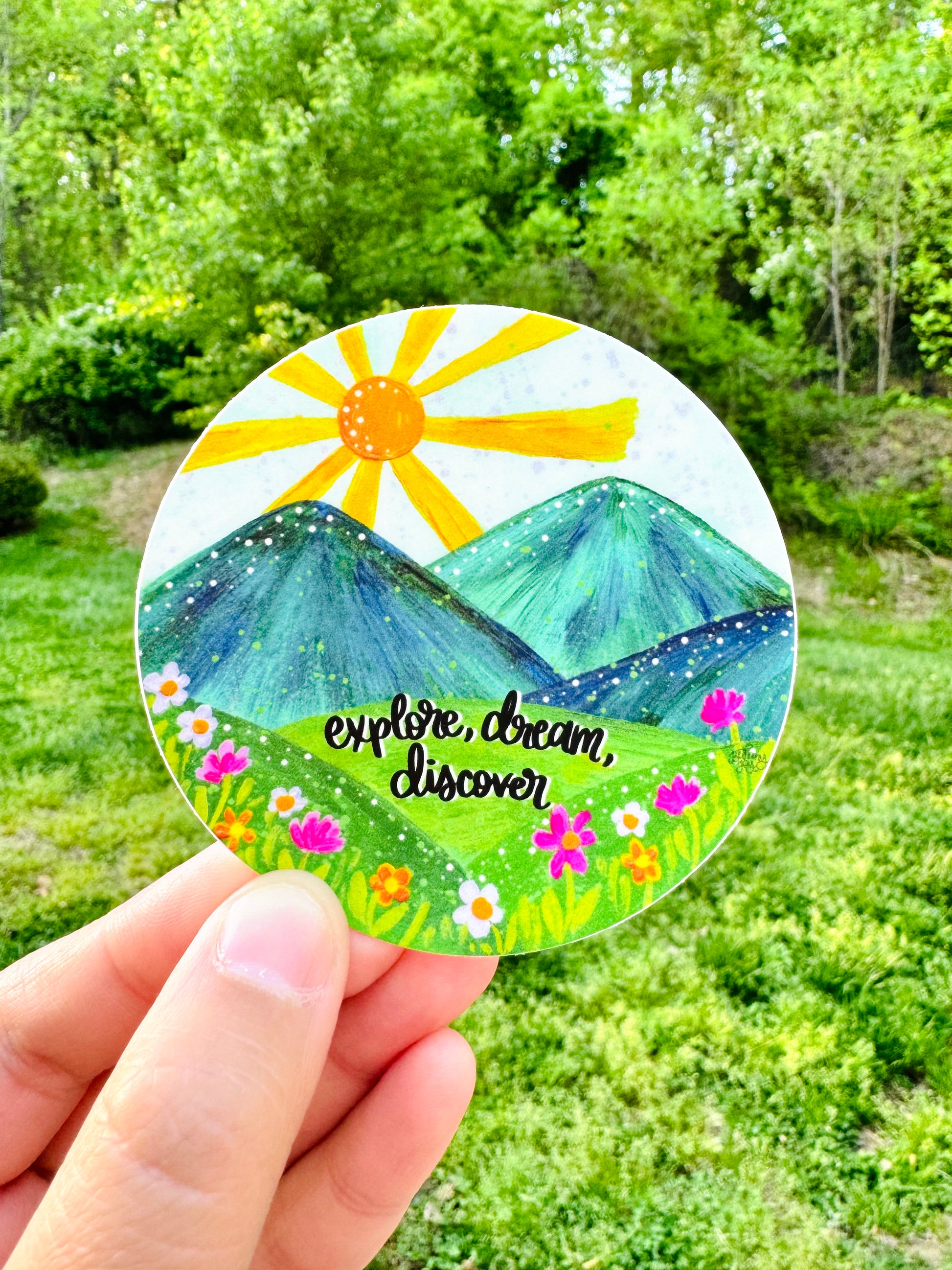 This listing is for one Explore, Dream, Discover mountain landscape sticker!