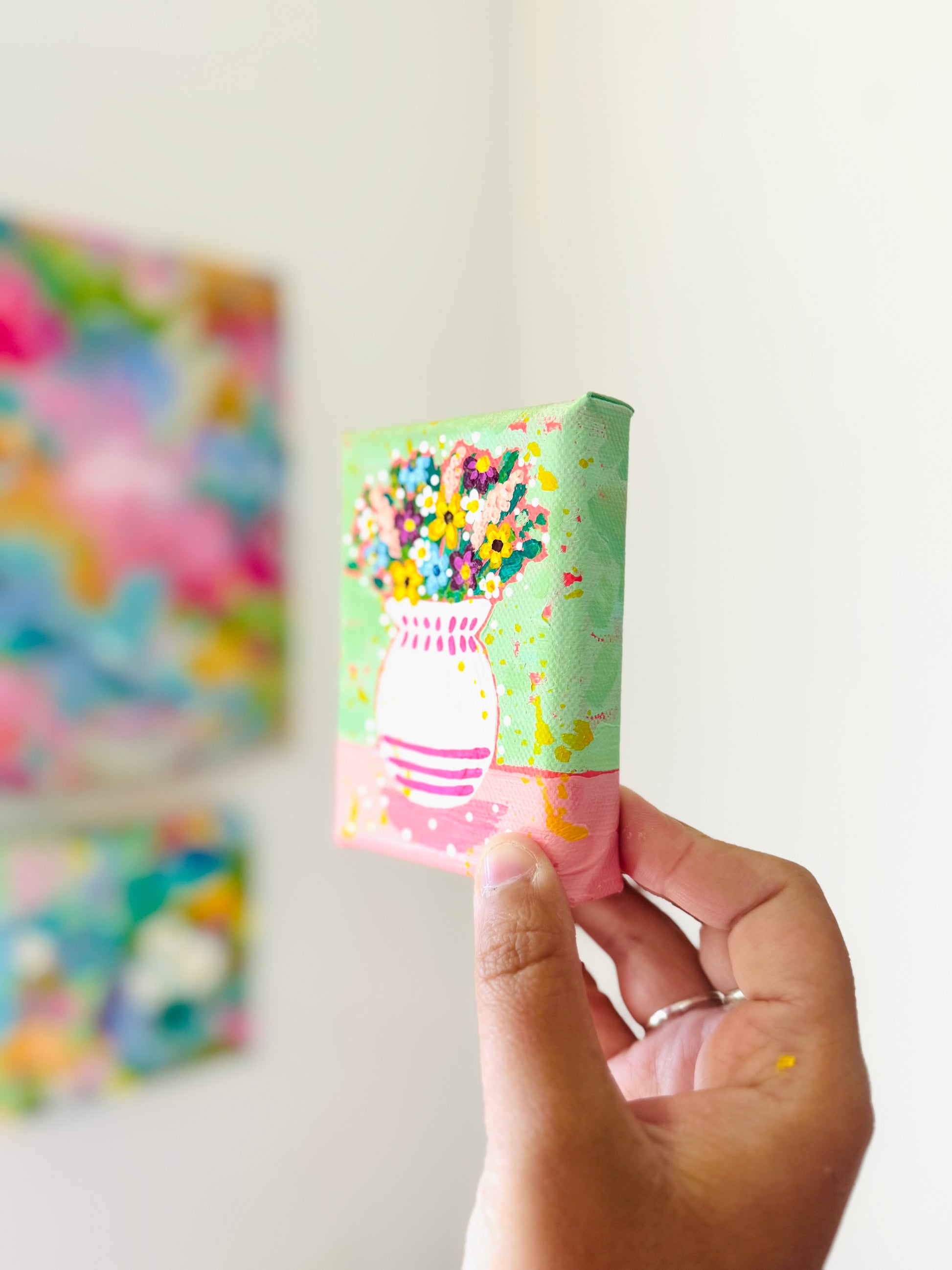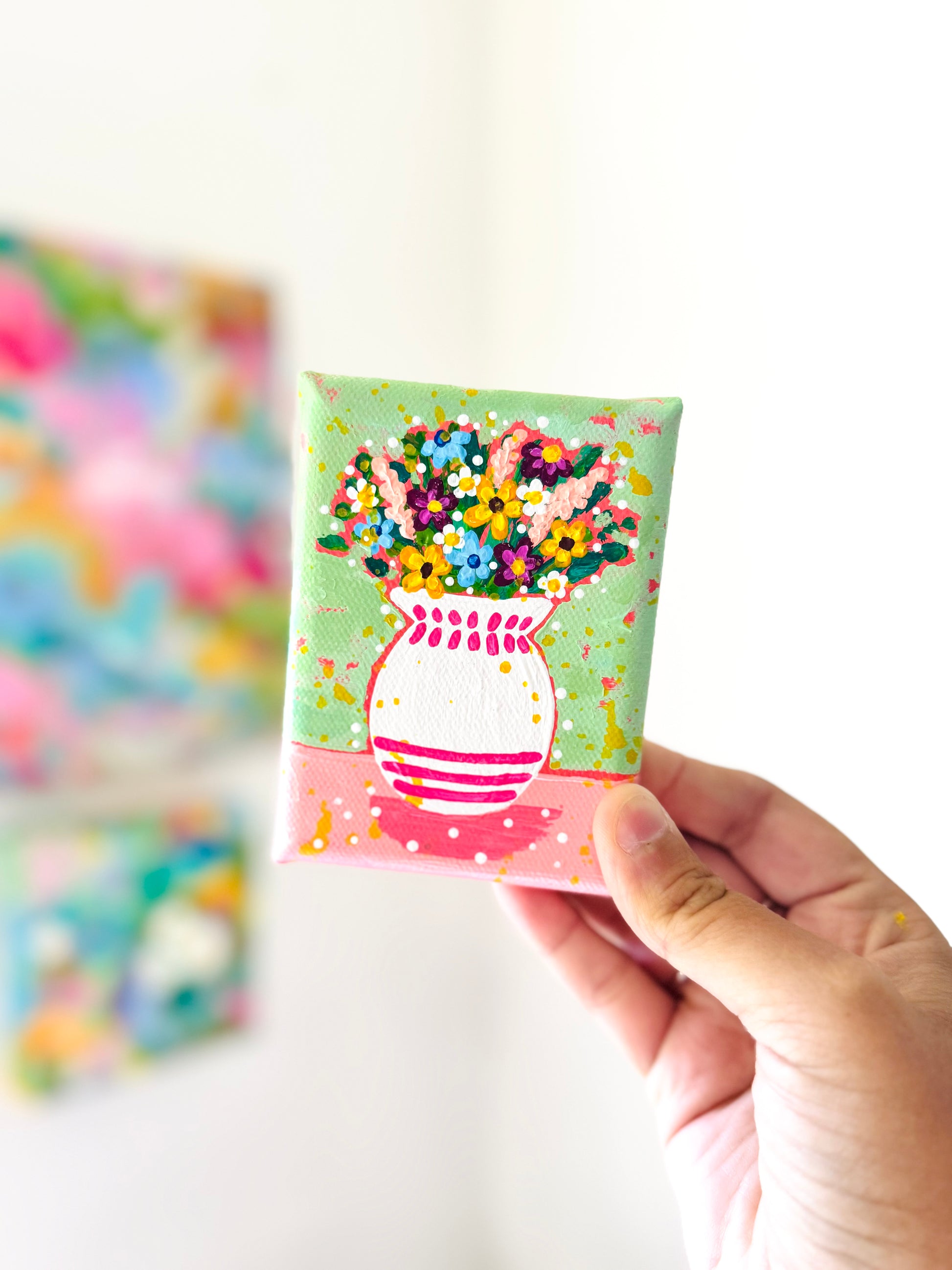 This original vibrant floral inspired painting was created on canvas that measures approximately 3x4 inches with .75 inch thick sides. The sides are painted all around to match the style/colors of the painting. This acrylic painting has been sealed with a semi-gloss varnish as well, for protection.