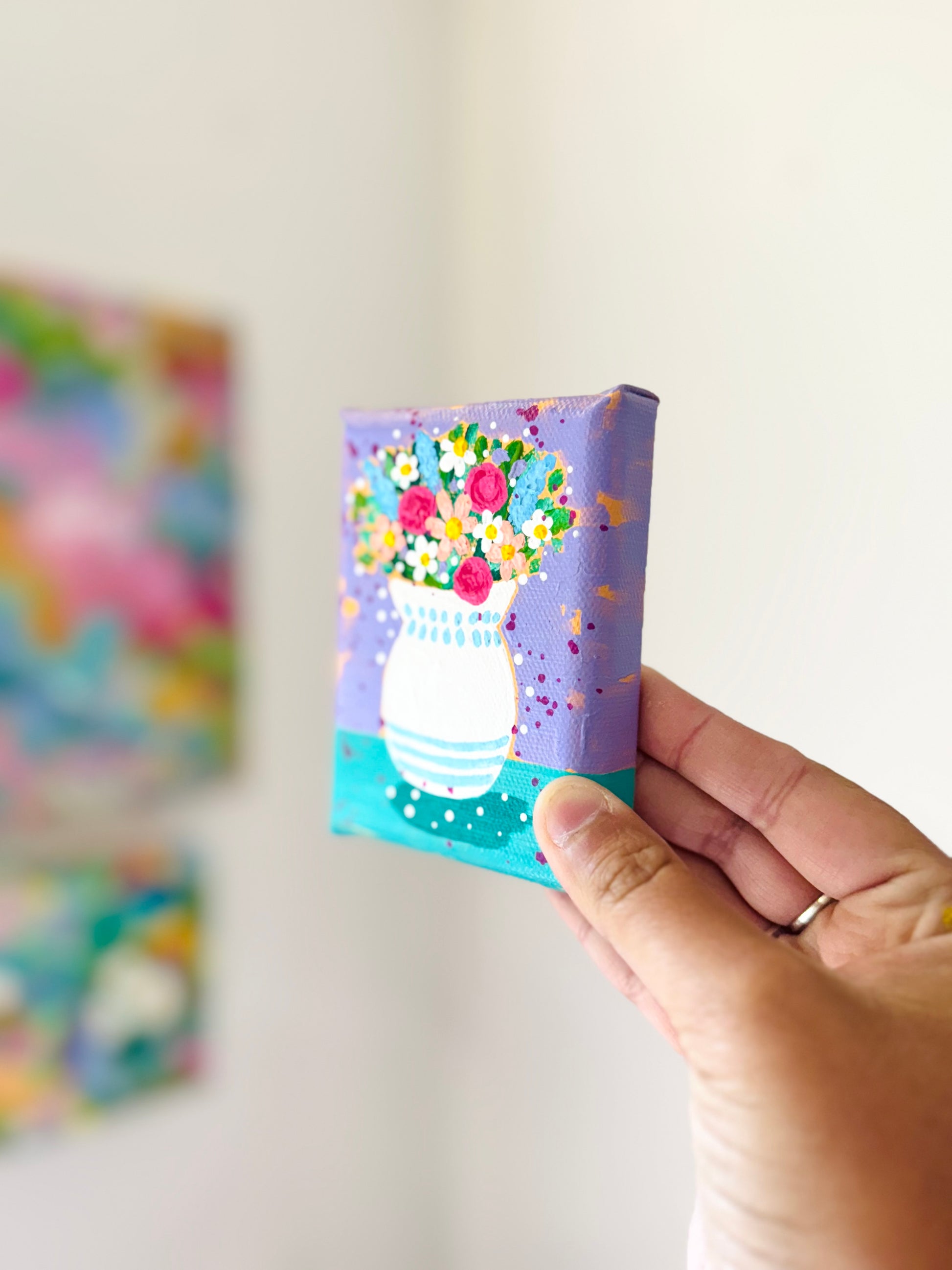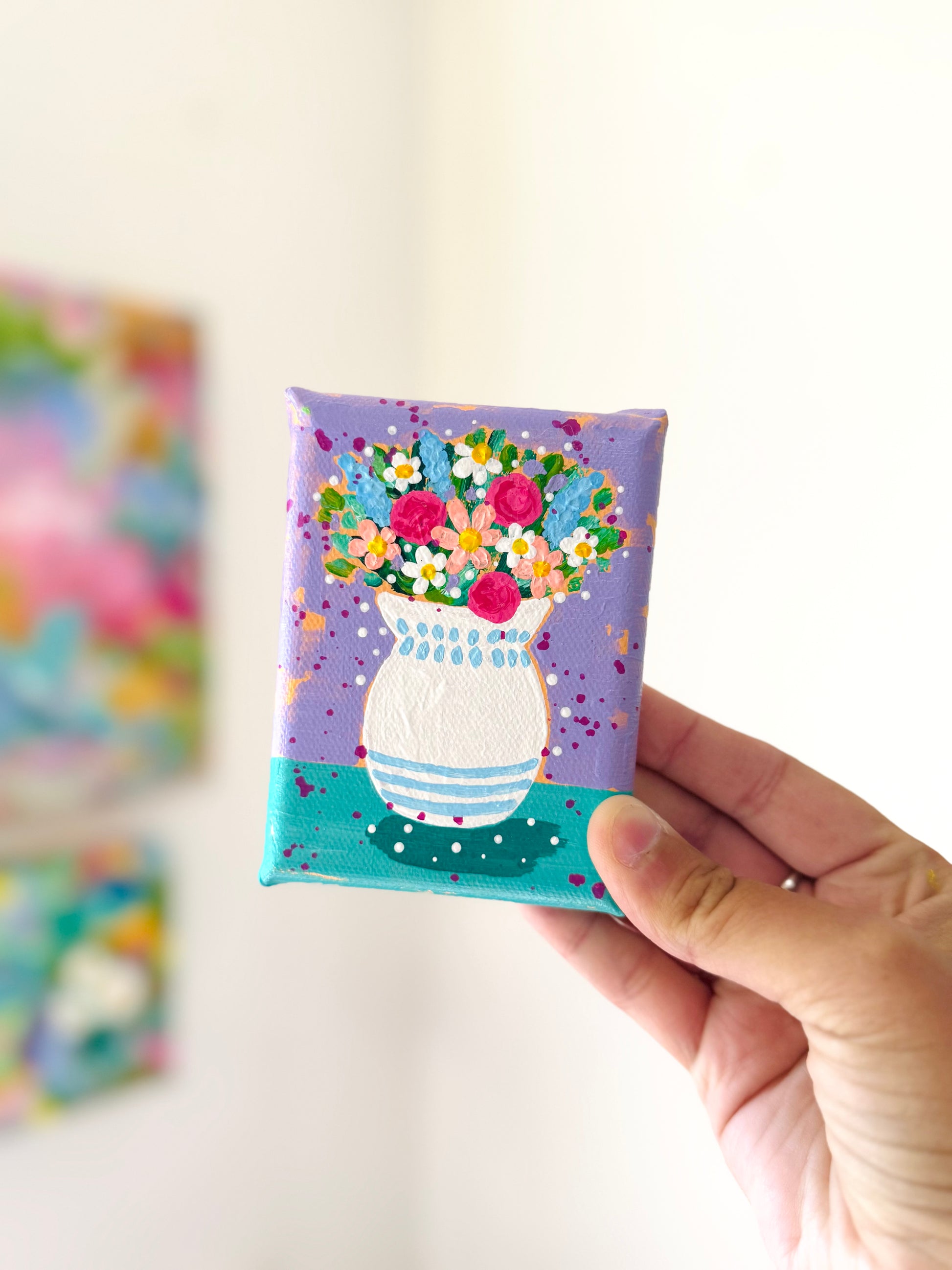 This original vibrant floral inspired painting was created on canvas that measures approximately 3x4 inches with .75 inch thick sides. The sides are painted all around to match the style/colors of the painting. This acrylic painting has been sealed with a semi-gloss varnish as well, for protection.