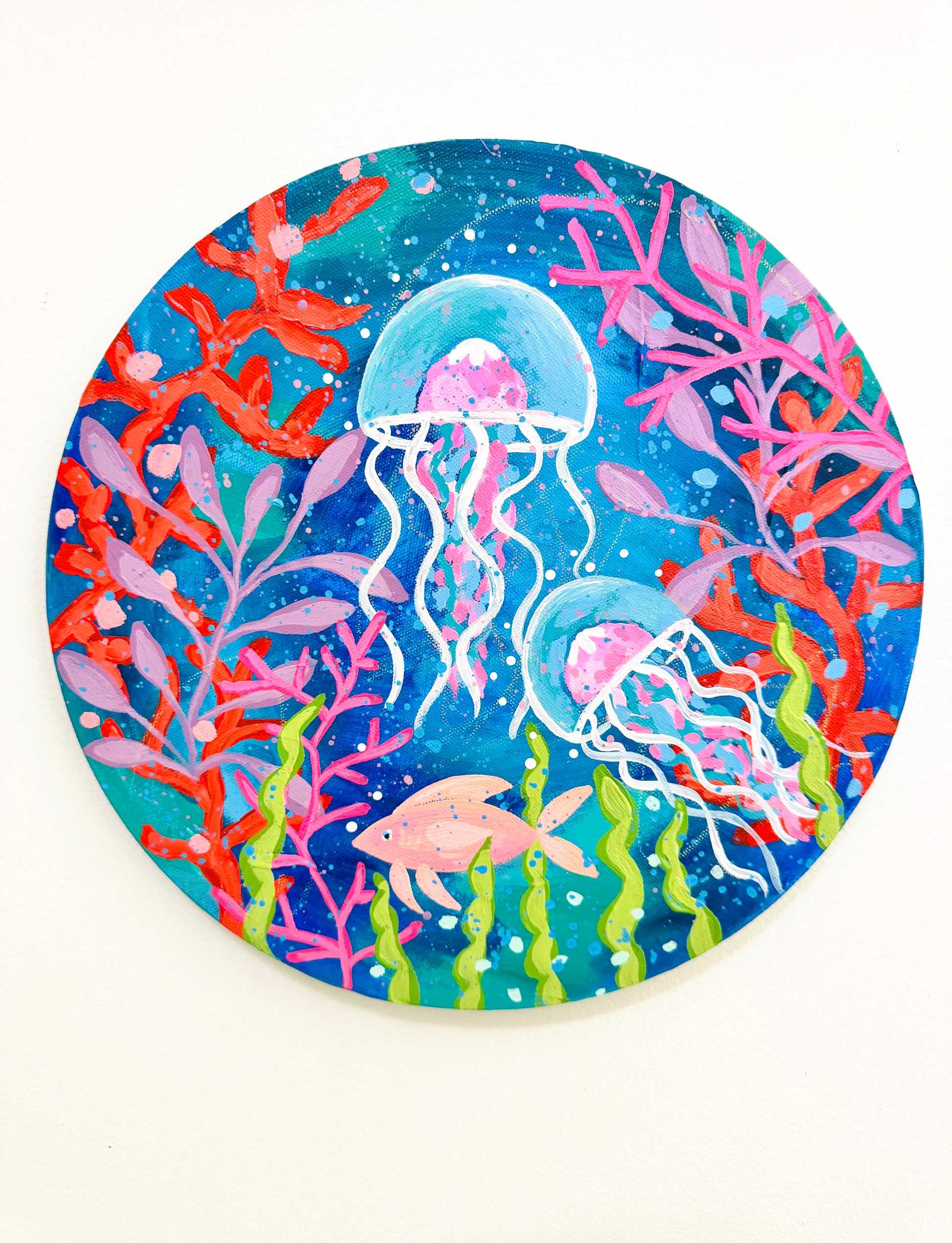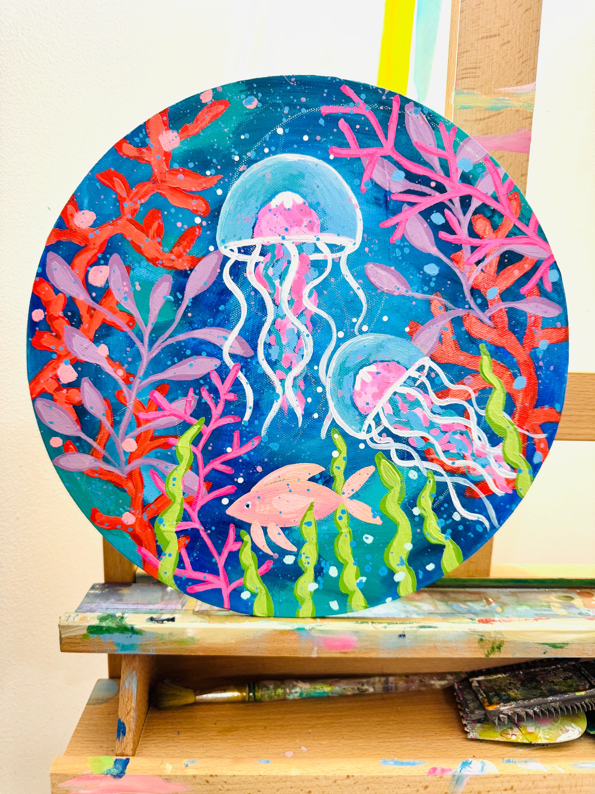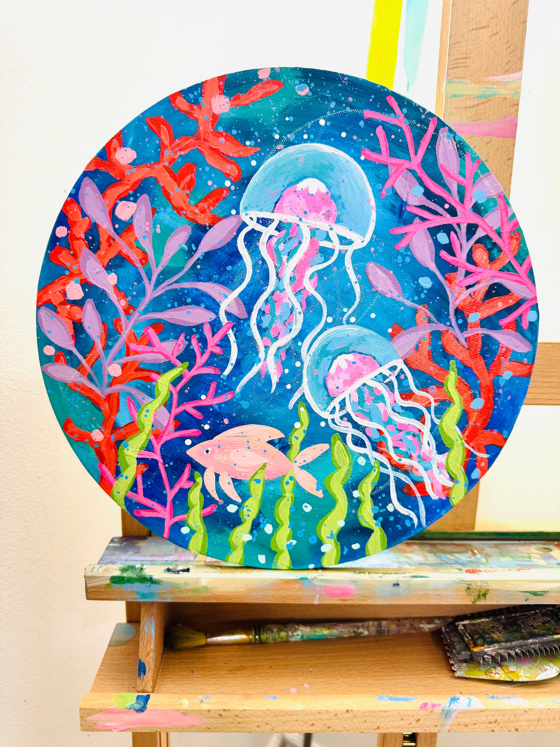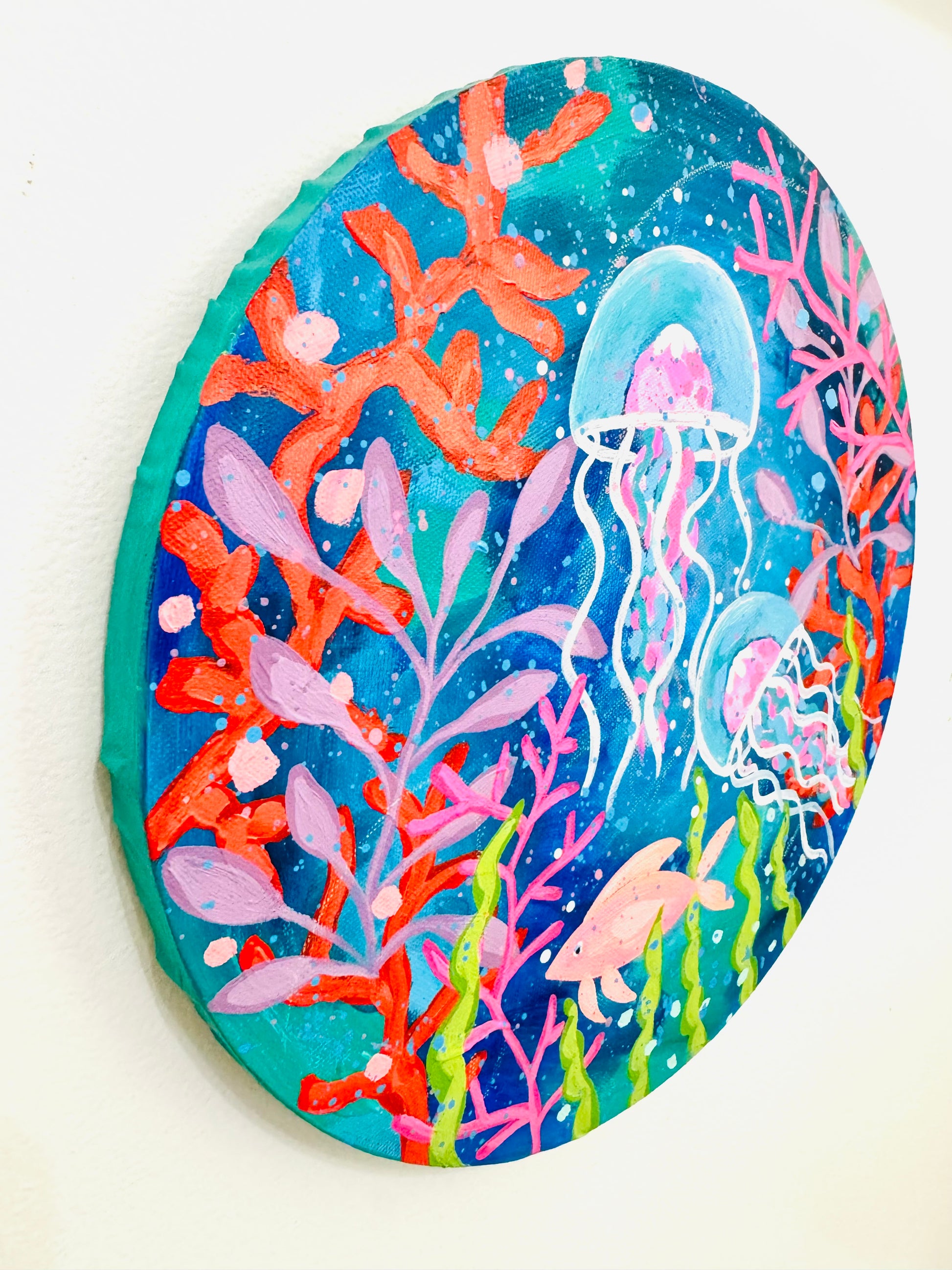 Complete with so many vibrant and layered underwater elements and some fabulous jellyfish and a little pink fish, this piece has been sealed with a semi-gloss varnish for added protection and a soft, sunlit glow.