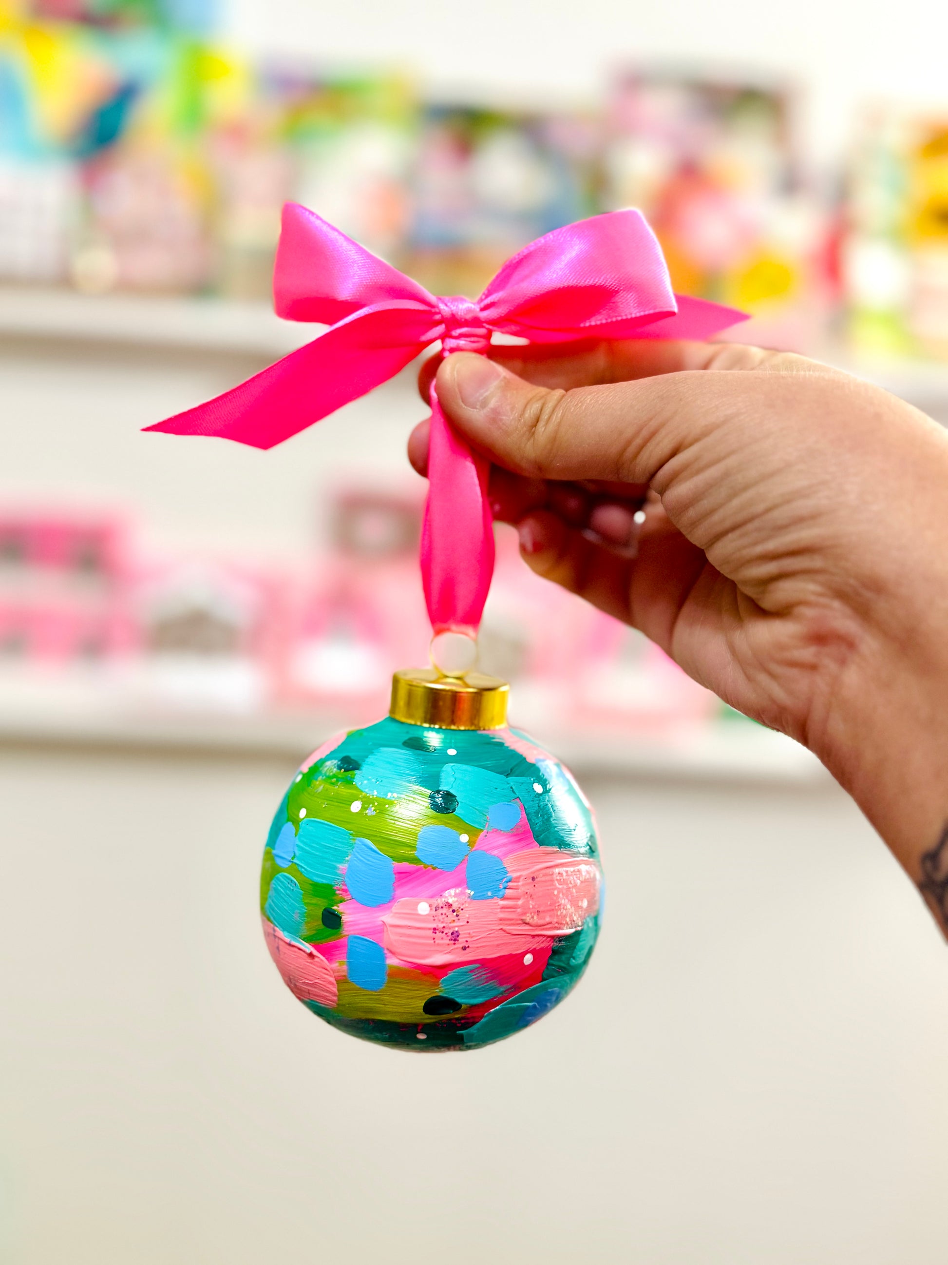 The ornament has been painted with acrylic paint and protected with a semi-gloss clear sealer. It features a variety of bright colors to liven up your tree and Christmas décor! The ornament is topped with a brass colored cap and features beautiful artisan ribbon for hanging. Complete with a little bit of sparkle!