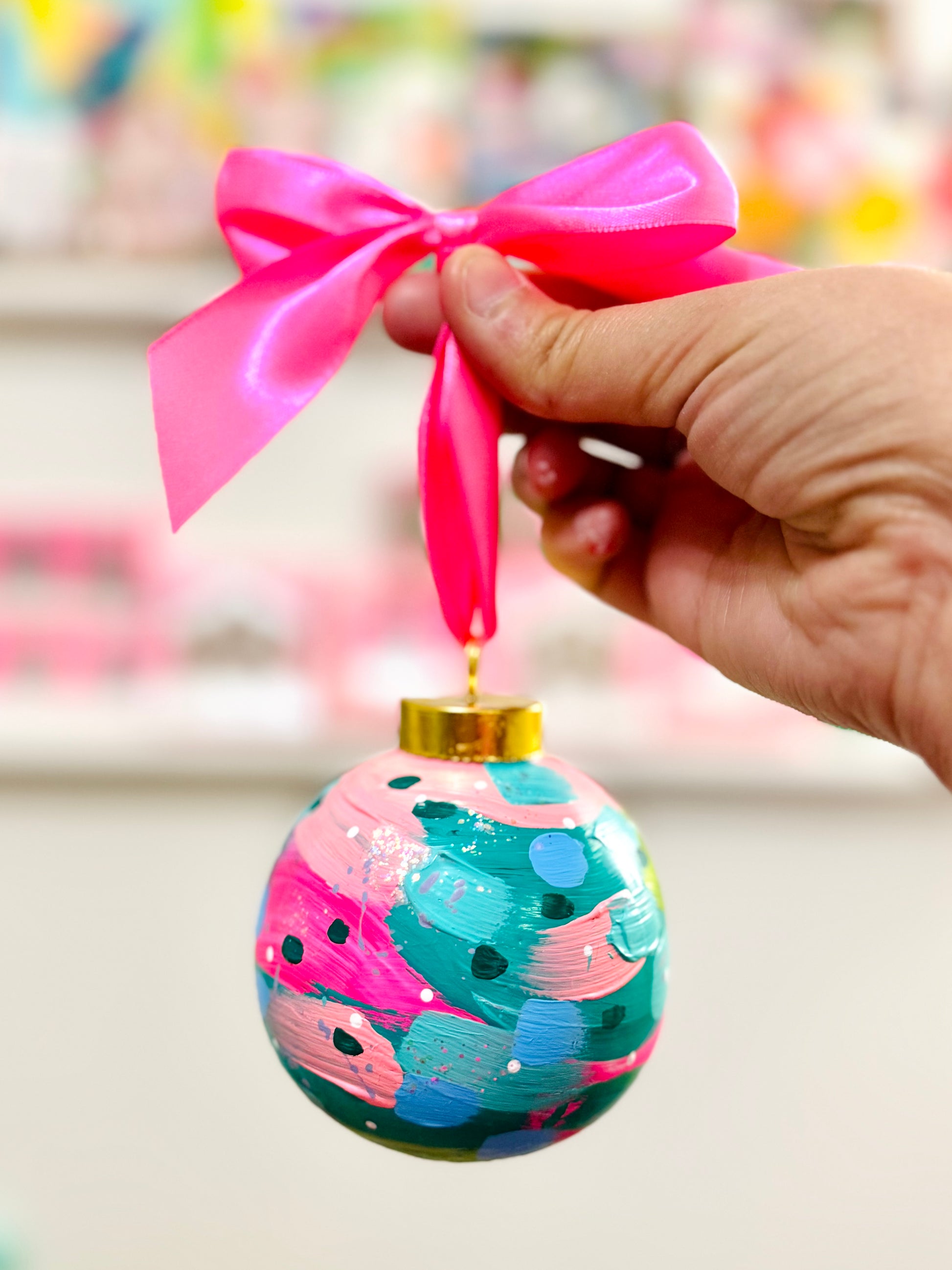 The ornament has been painted with acrylic paint and protected with a semi-gloss clear sealer. It features a variety of bright colors to liven up your tree and Christmas décor! The ornament is topped with a brass colored cap and features beautiful artisan ribbon for hanging. Complete with a little bit of sparkle!