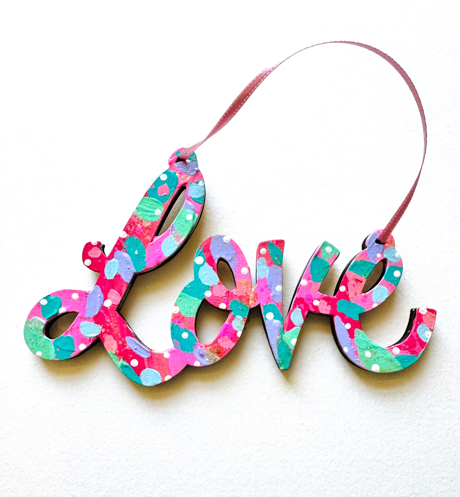 Here's a bit about how each ornament is made…the love shape was hand drawn/written by me and then my husband cut each love shape out of wood.