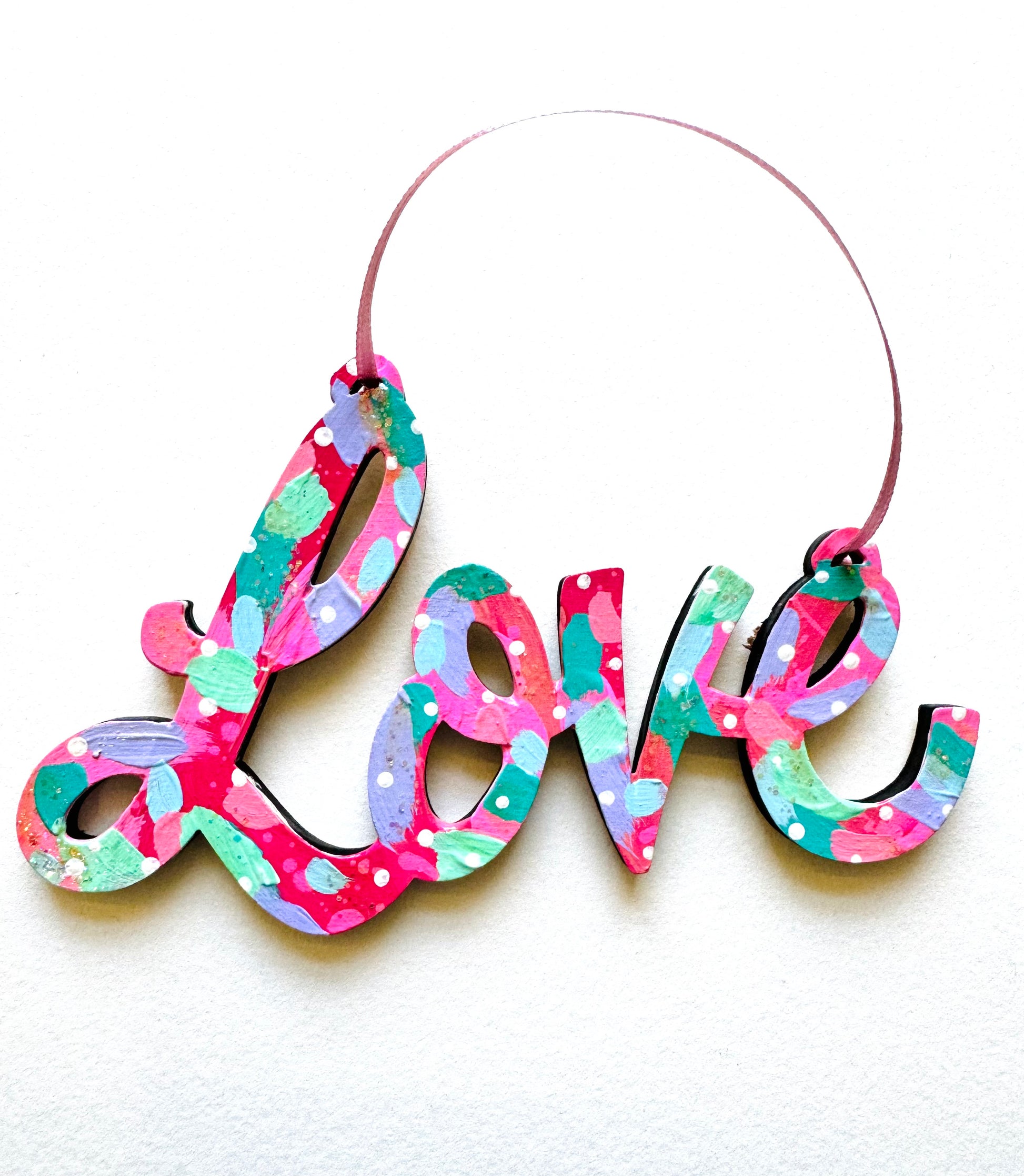 Here's a bit about how each ornament is made…the love shape was hand drawn/written by me and then my husband cut each love shape out of wood.