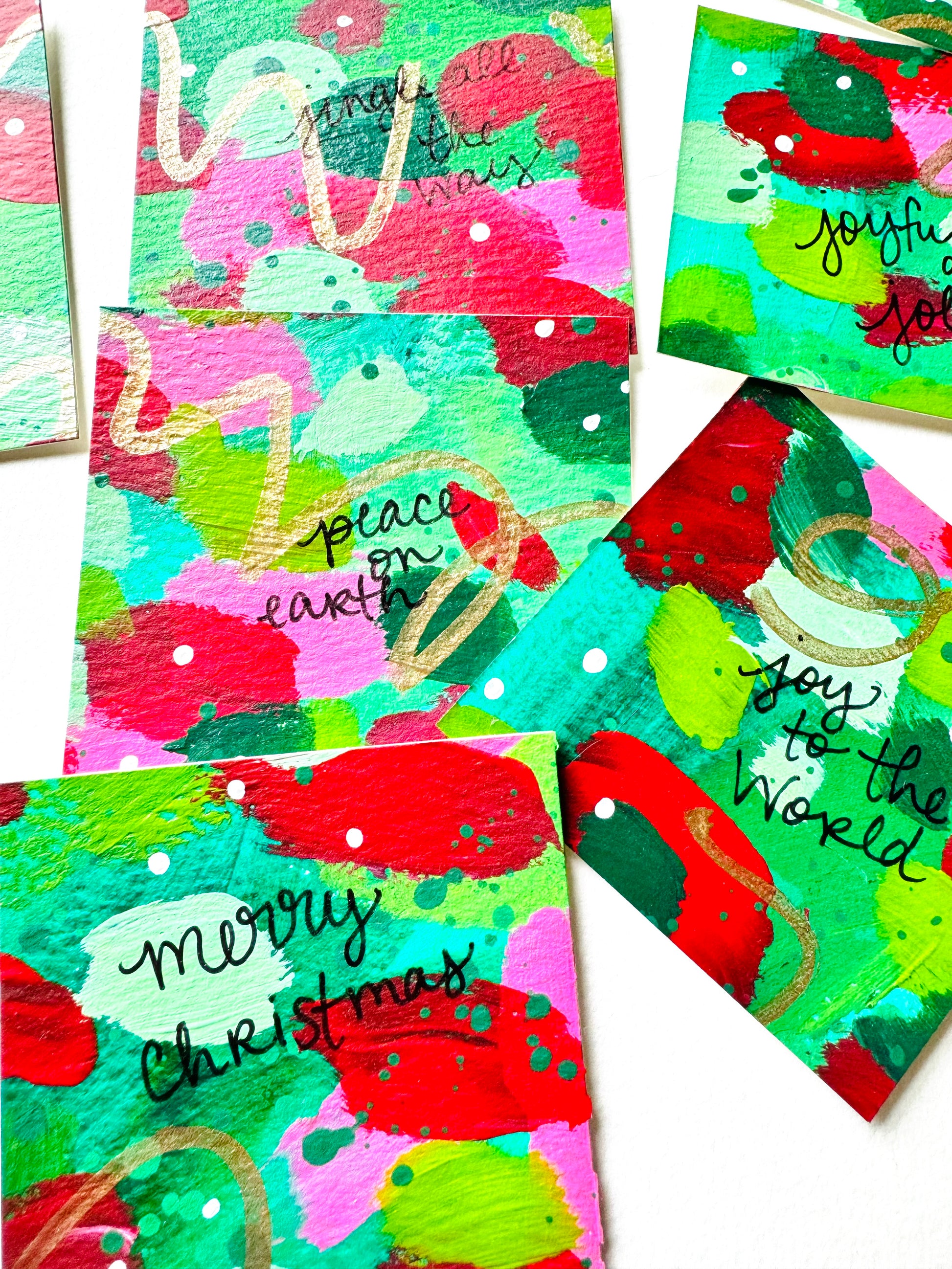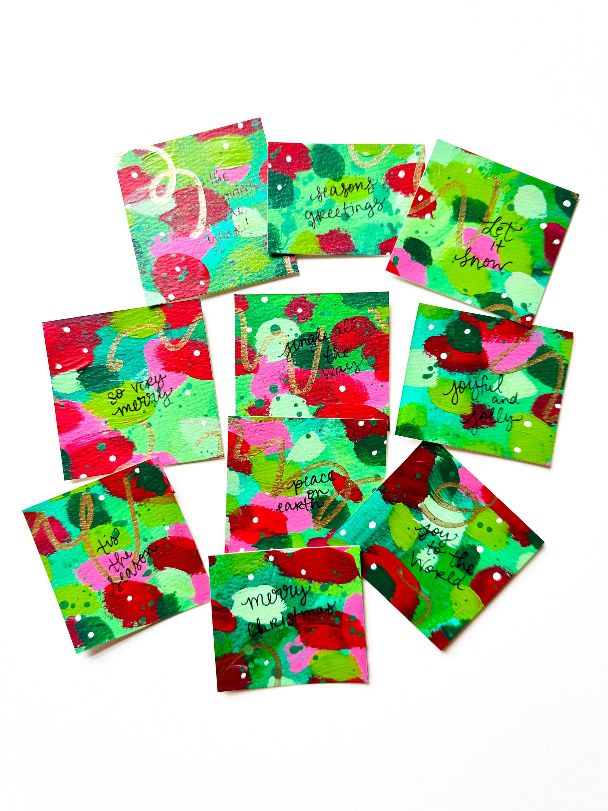 The pack will include 10 mini original, random, abstract mixed media paintings on paper with a variety of different sayings (ex. Merry Christmas, Tis the Season, Joy to the World, Peace on Earth, etc.)