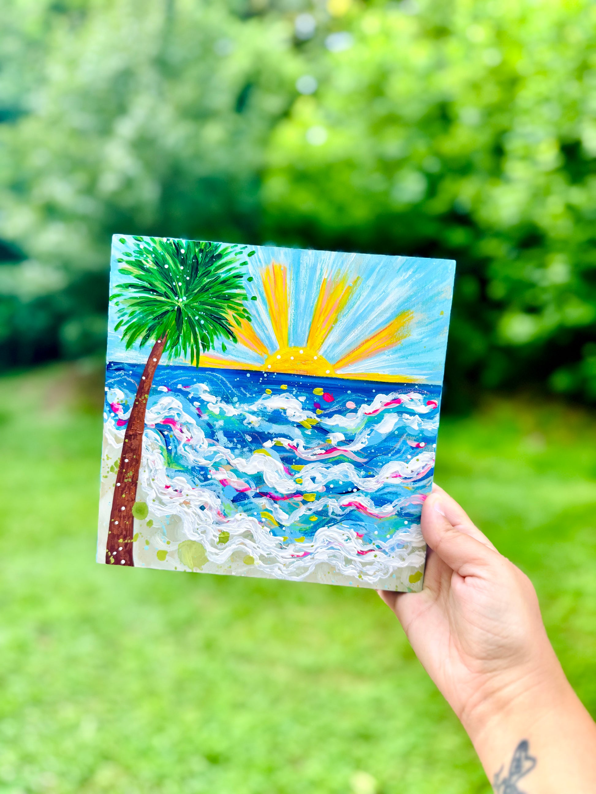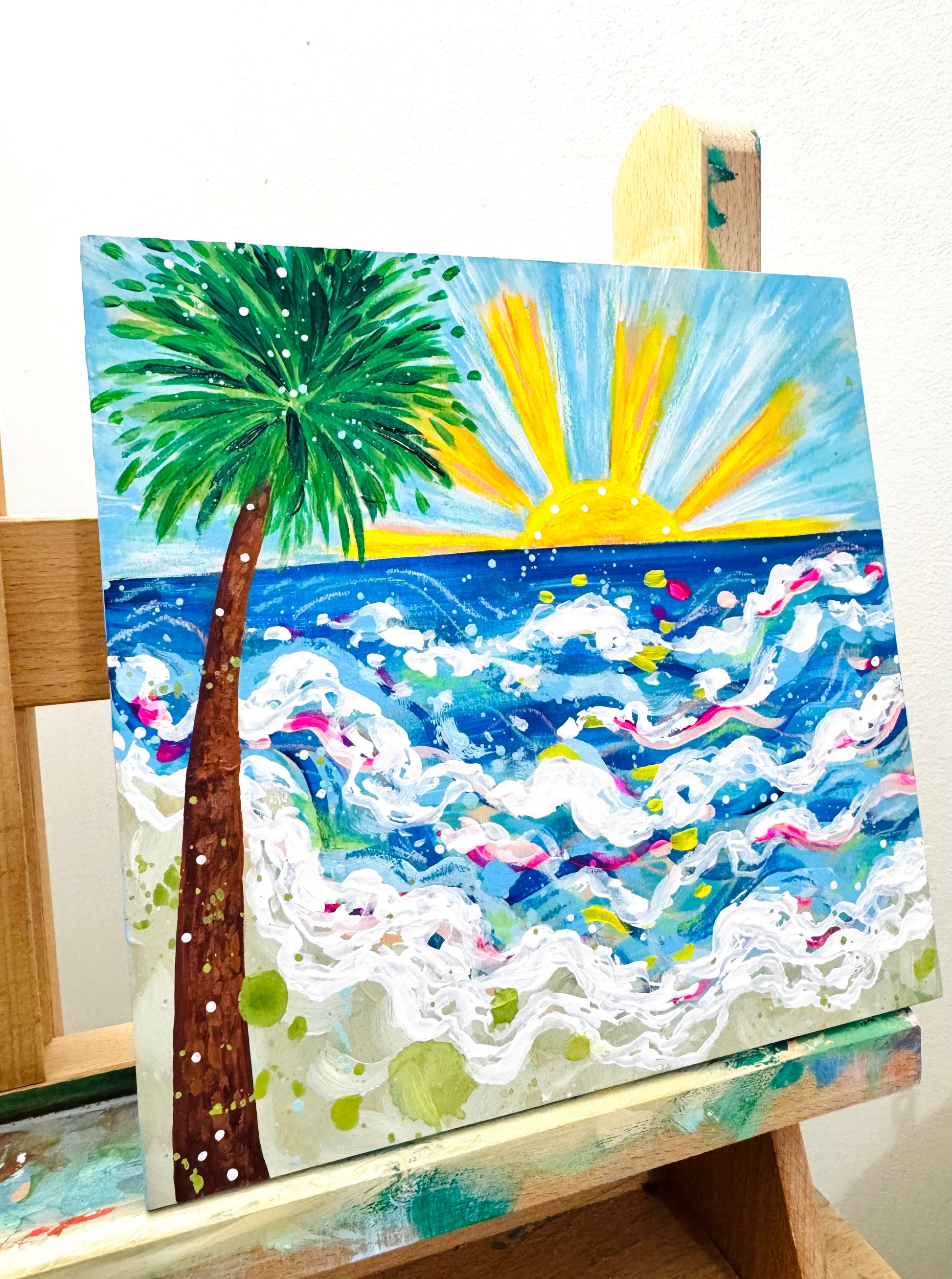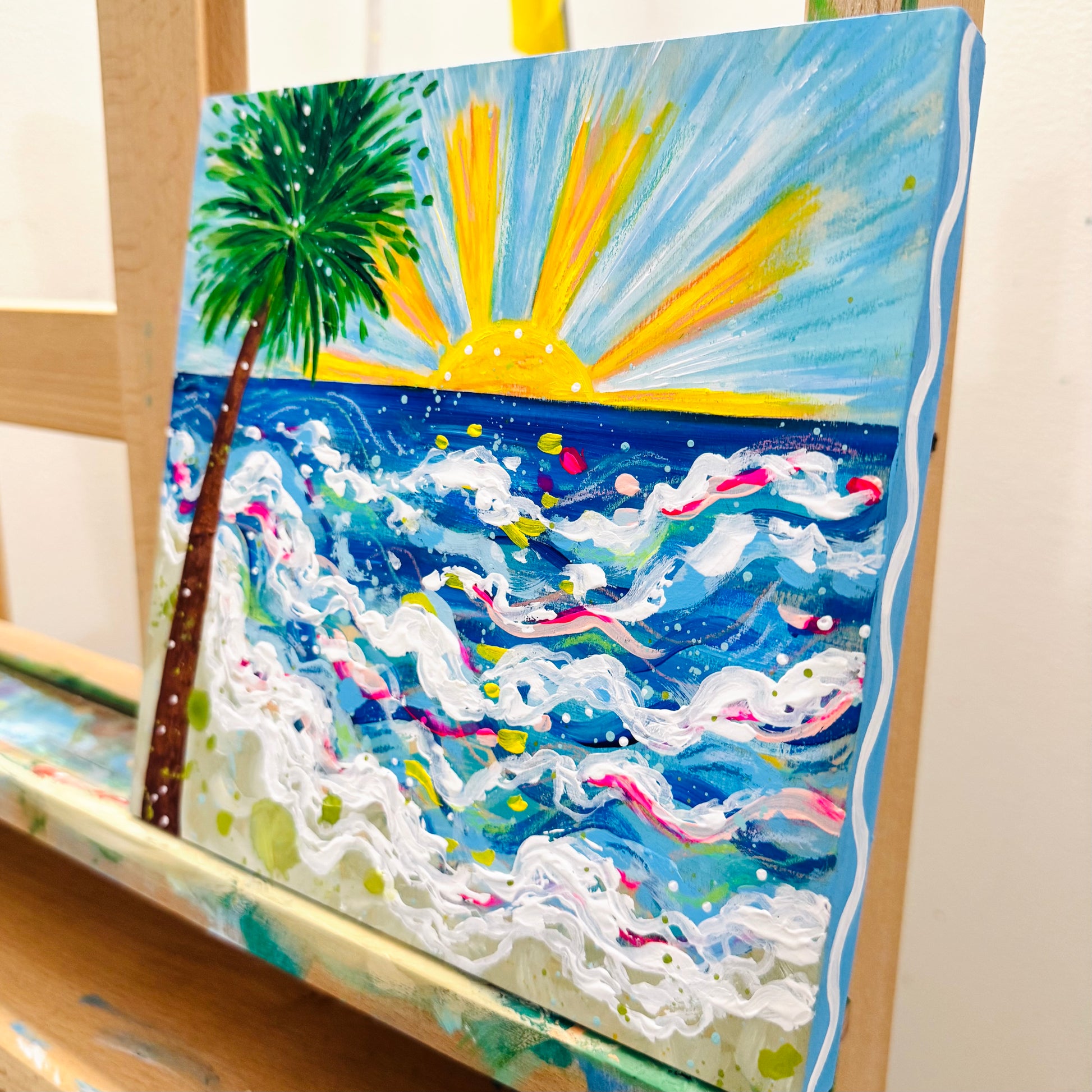 "Palm Dream" is an original, colorful beach-inspired painting created with acrylic on an 8x8 inch wood panel with .5 inch sides. The sides are fully painted in sky blue with white wavy accents to complement the colors of the artwork, giving it a finished, ready-to-display look from every angle.
