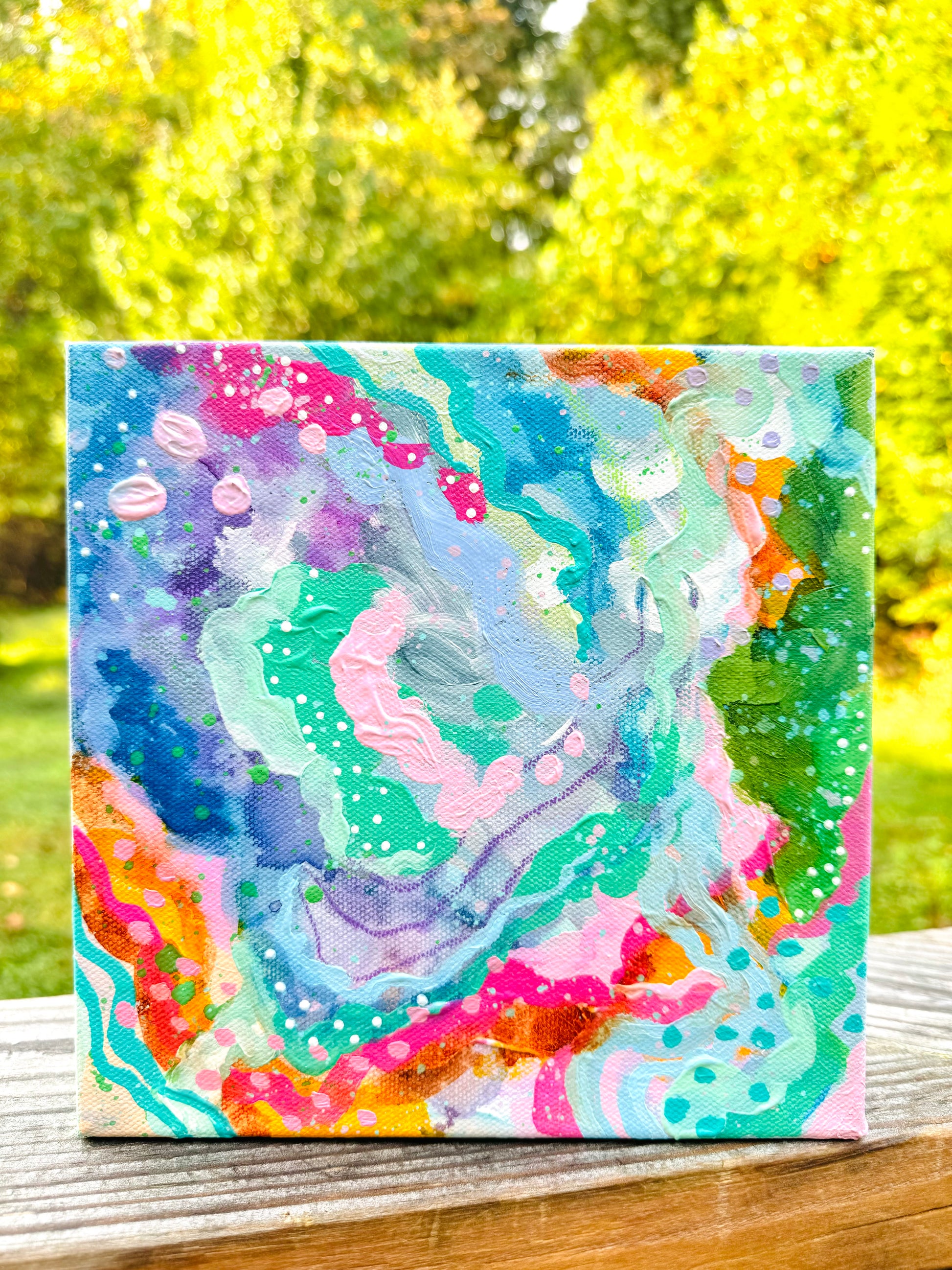 This original abstract painting was created on canvas that measures approximately 8x8 inches with 1.5 inch thick sides. The sides are painted all around to match the style/colors of the painting. This acrylic painting has been sealed with a semi-gloss varnish as well, for protection.