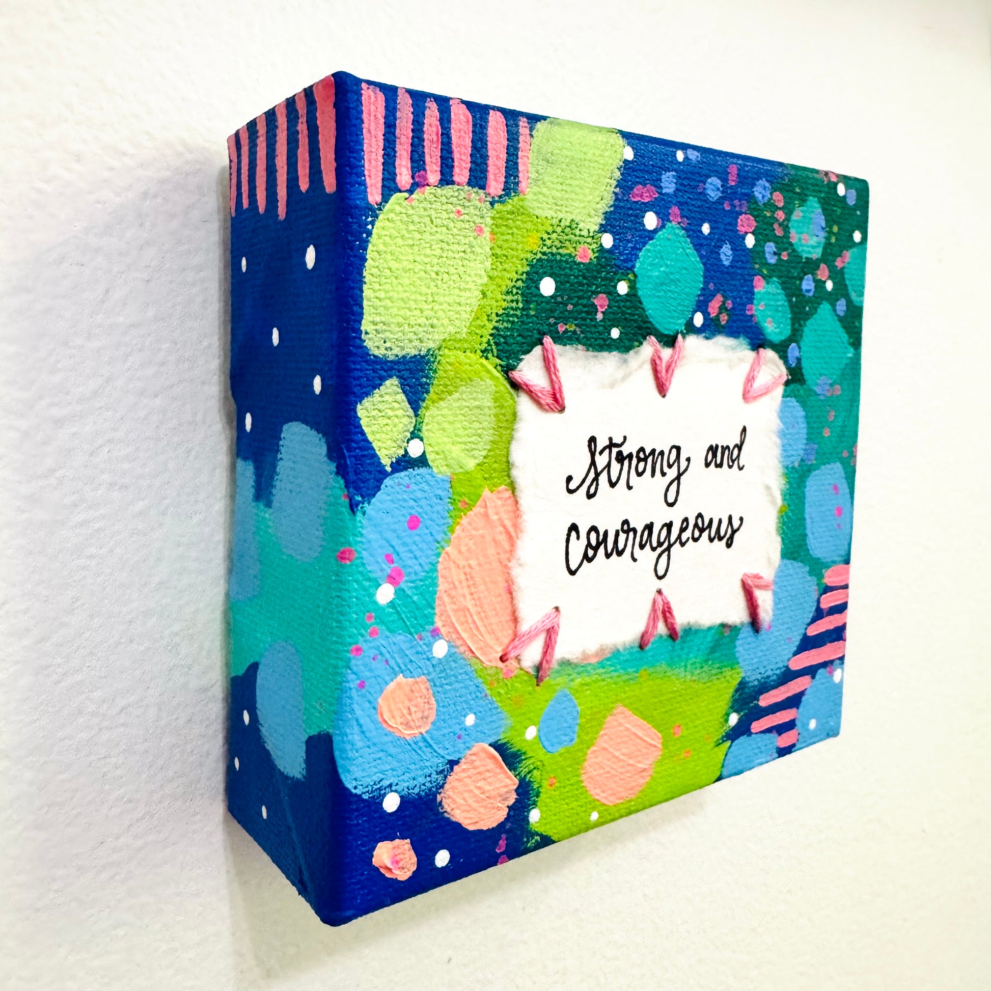 Strong and Courageous 4x4 inch original abstract canvas with embroidery thread accents