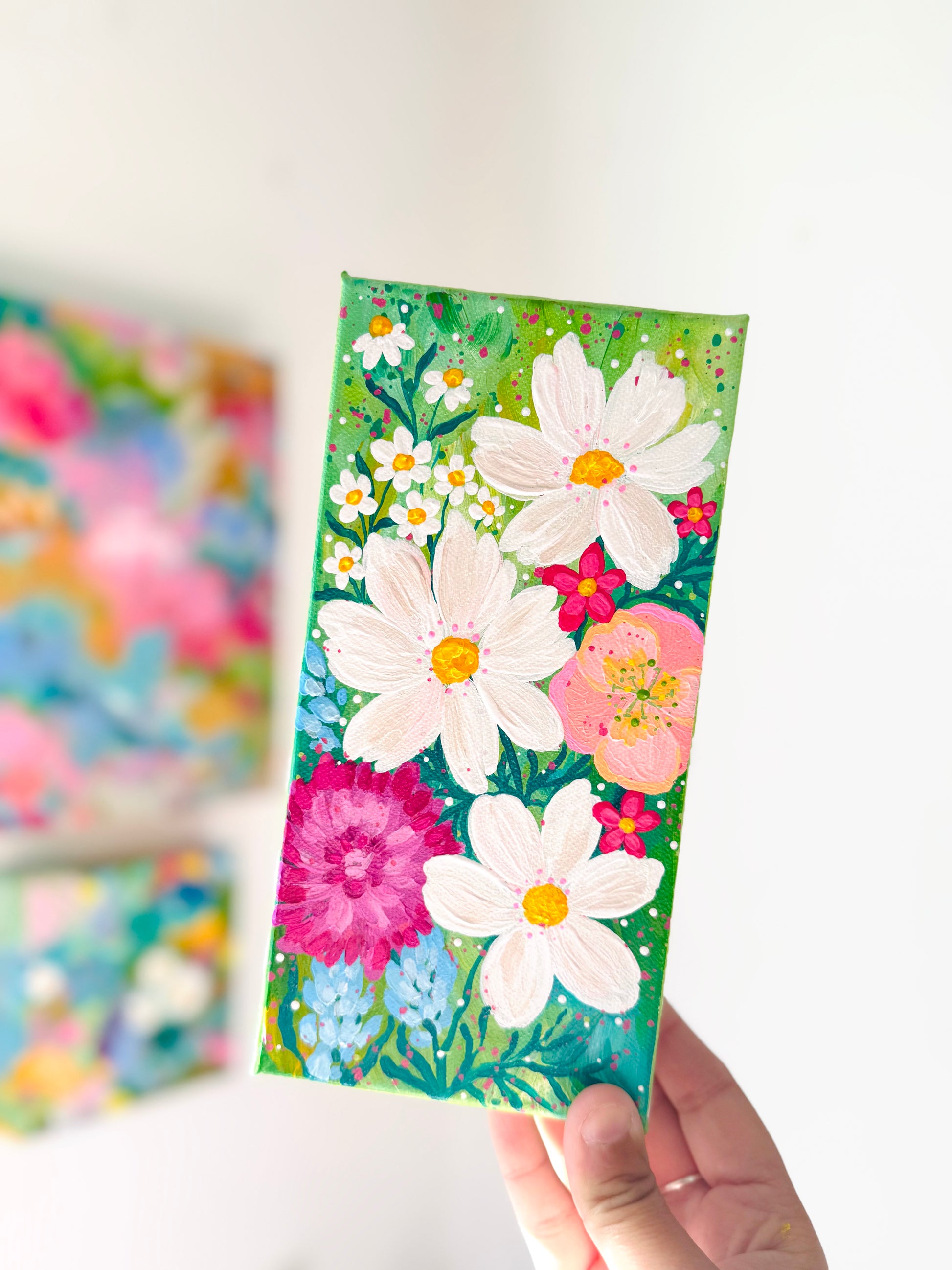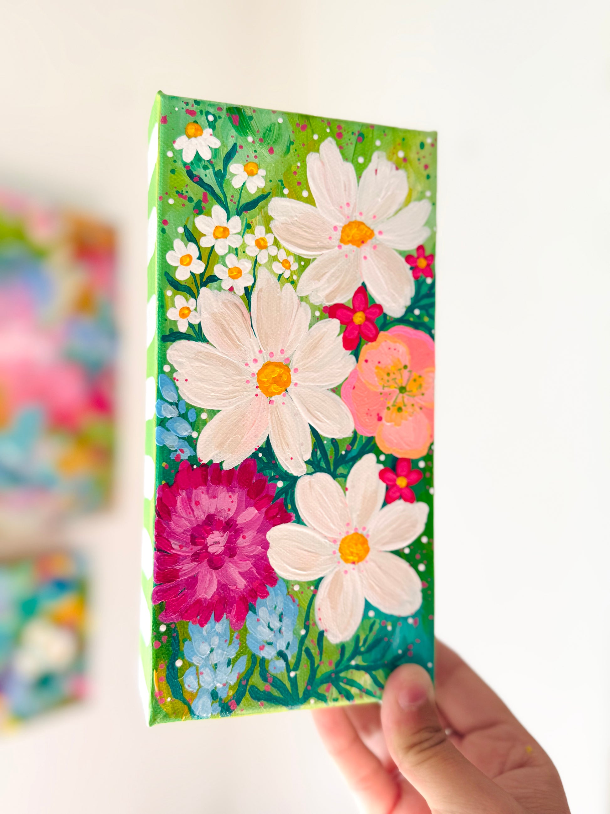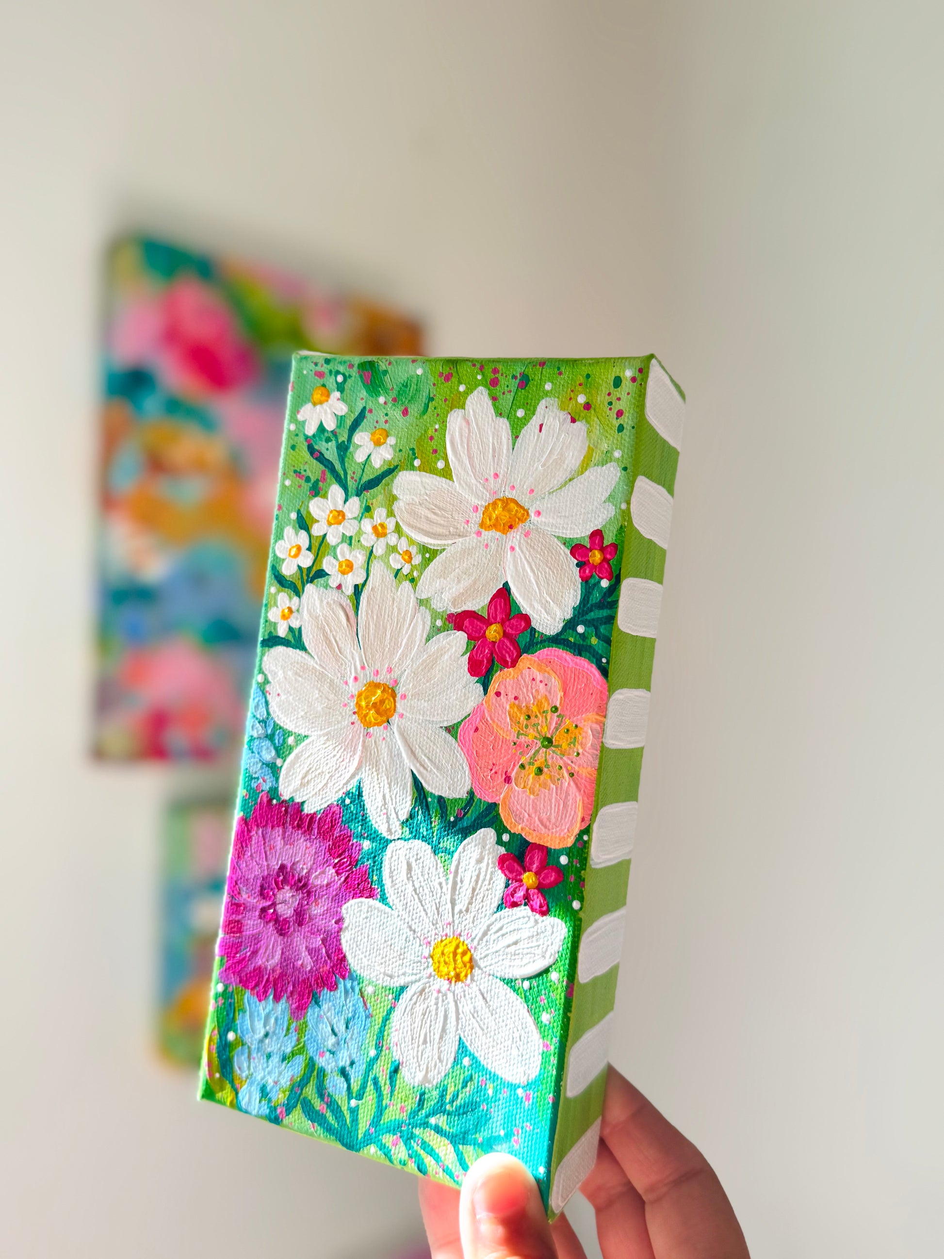 "Summer Meadow" is an original, colorful floral-inspired painting created with acrylic on a 4x8 inch canvas with 1.5 inch gallery-wrapped sides. The sides are fully painted with some whimsical green and white stripes to complement the colors of the artwork, giving it a finished, ready-to-display look from every angle.