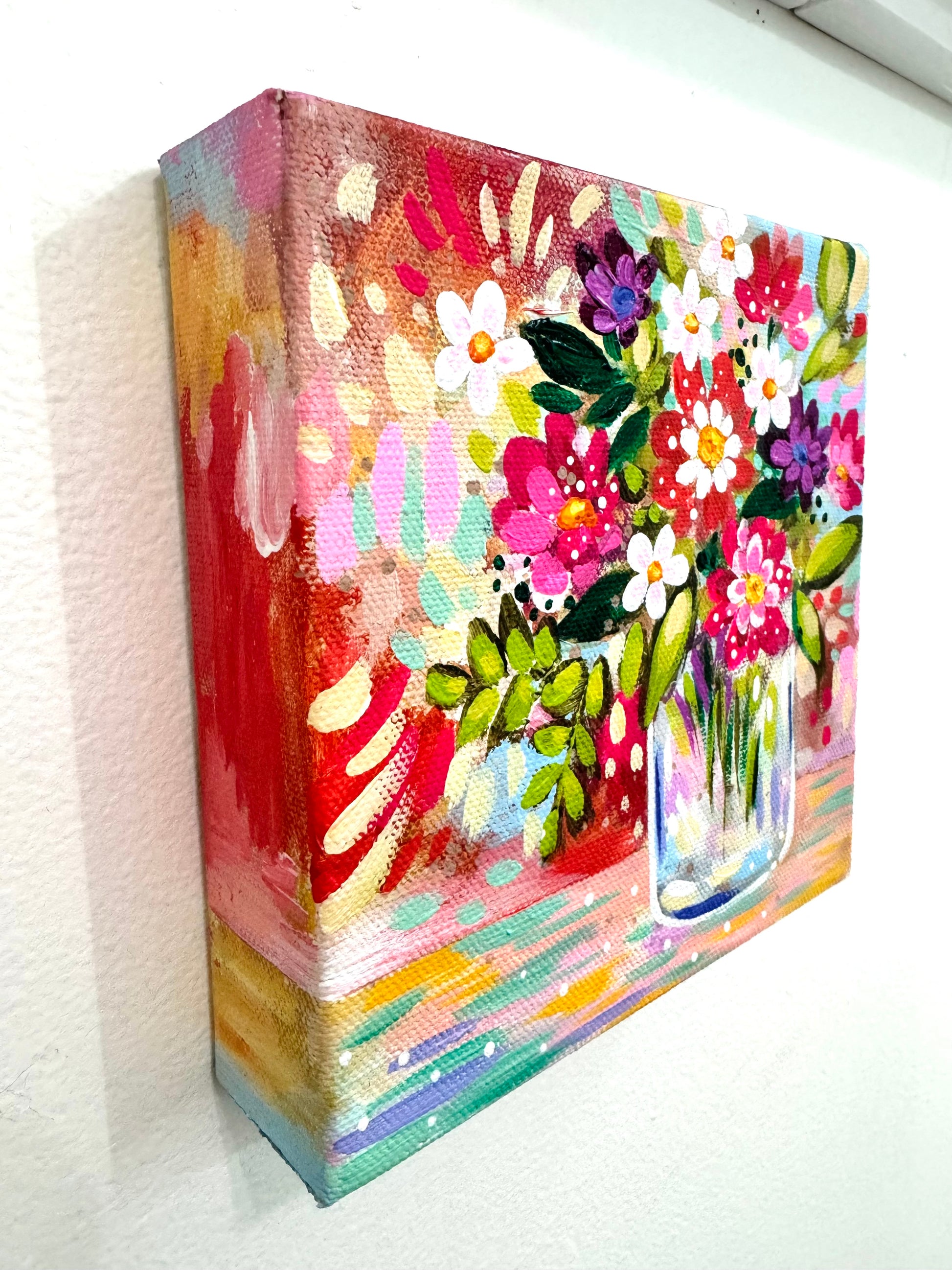 Whimsical, colorful, and full of playful movement, this floral piece feels lighthearted and joyful, with layered brushstrokes and vibrant color creating a sense of energy and bloom. It’s a small but expressive piece that brings a cheerful presence to any space.